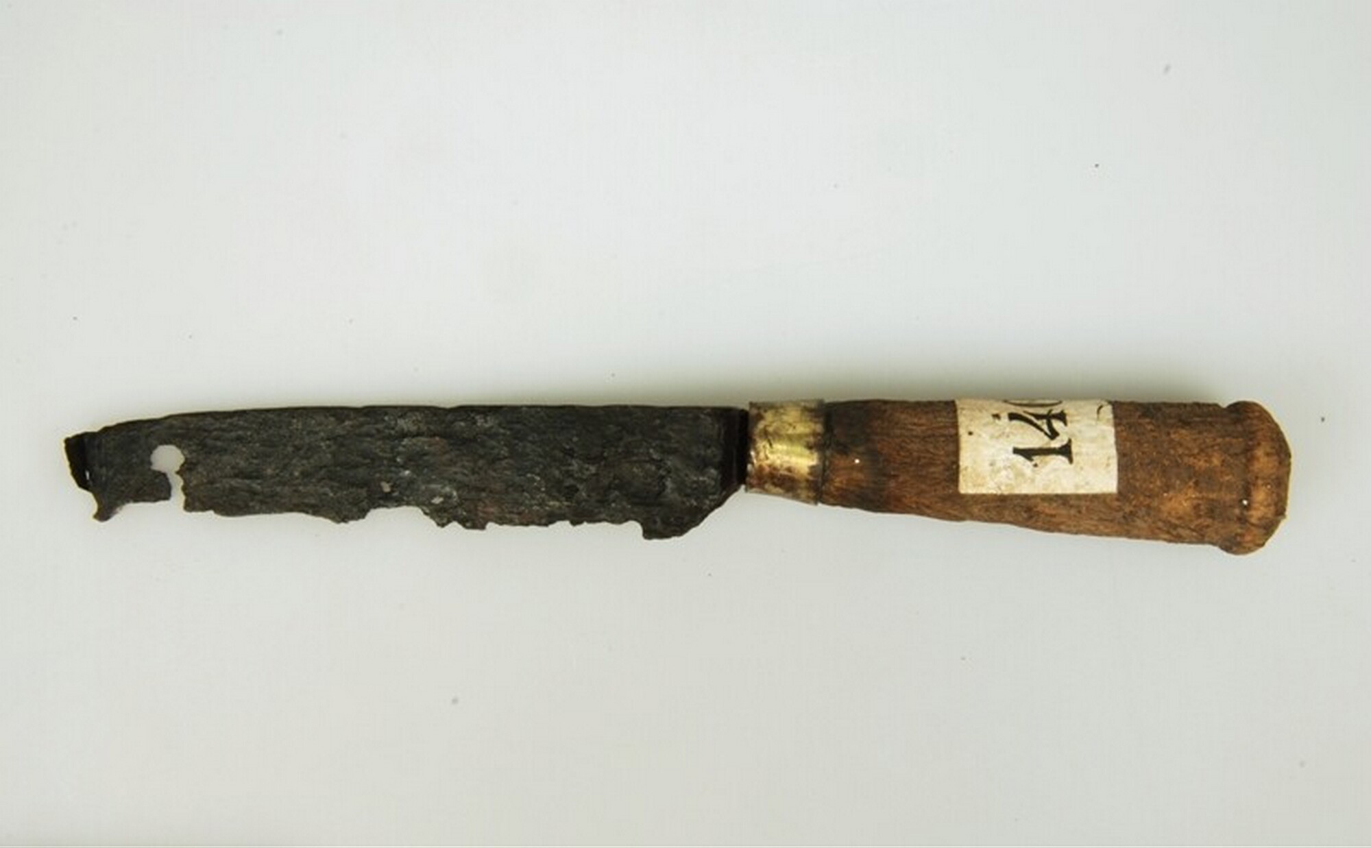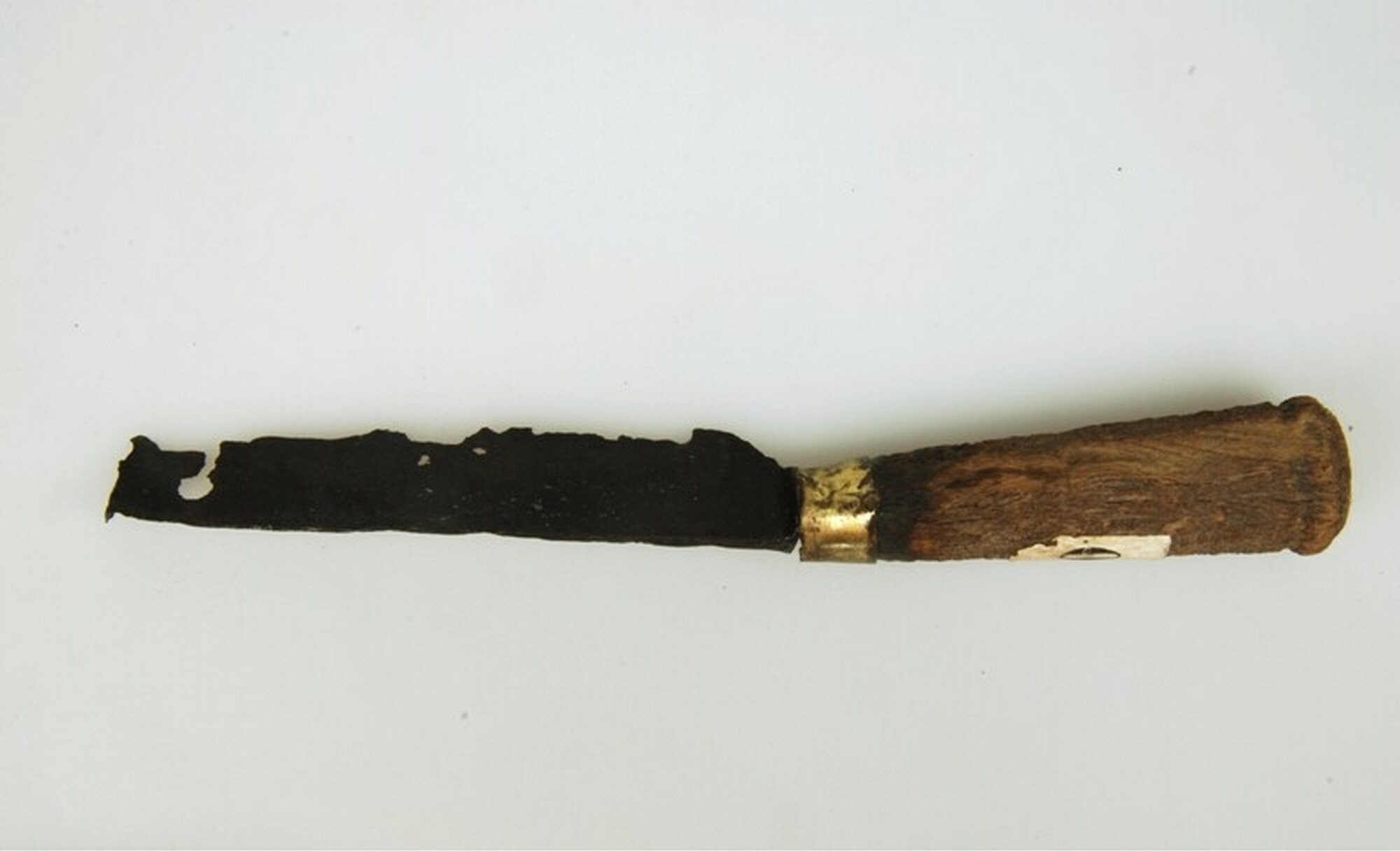 Mes; fe-mes-; messing stootplaat en houten heft; het lemmet is gefragmenteerd en aan het uiteinde verbogen