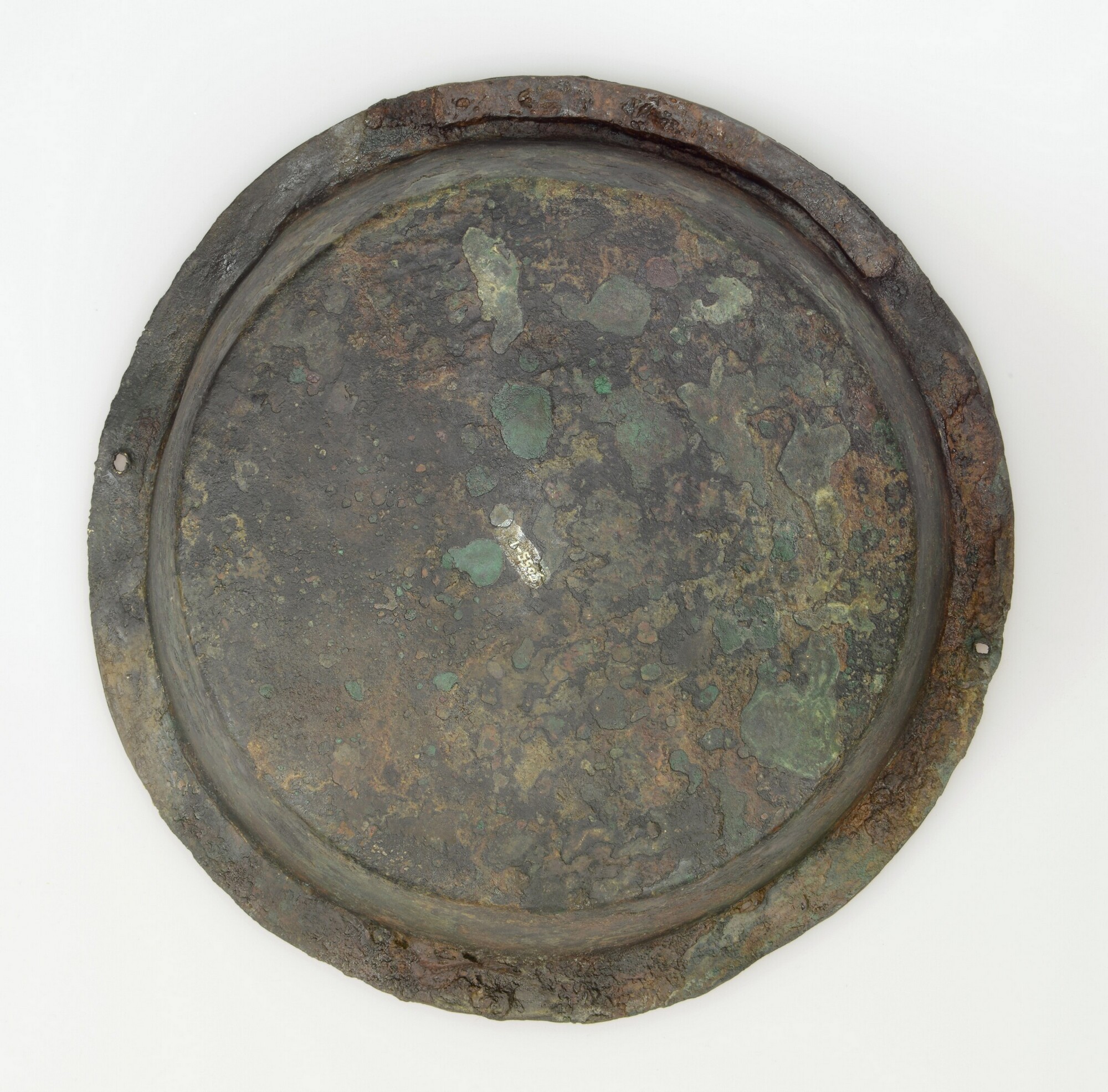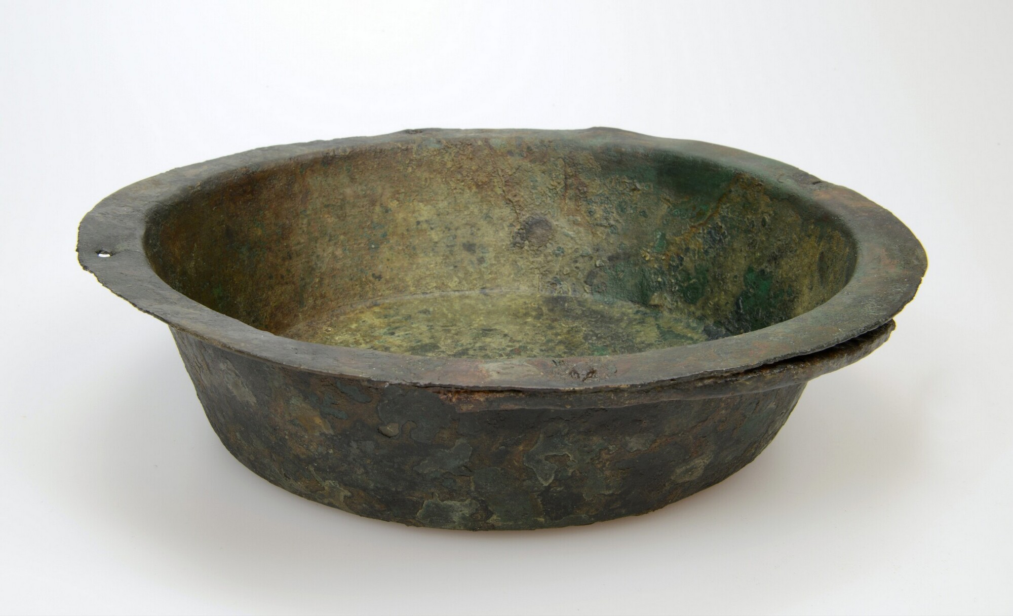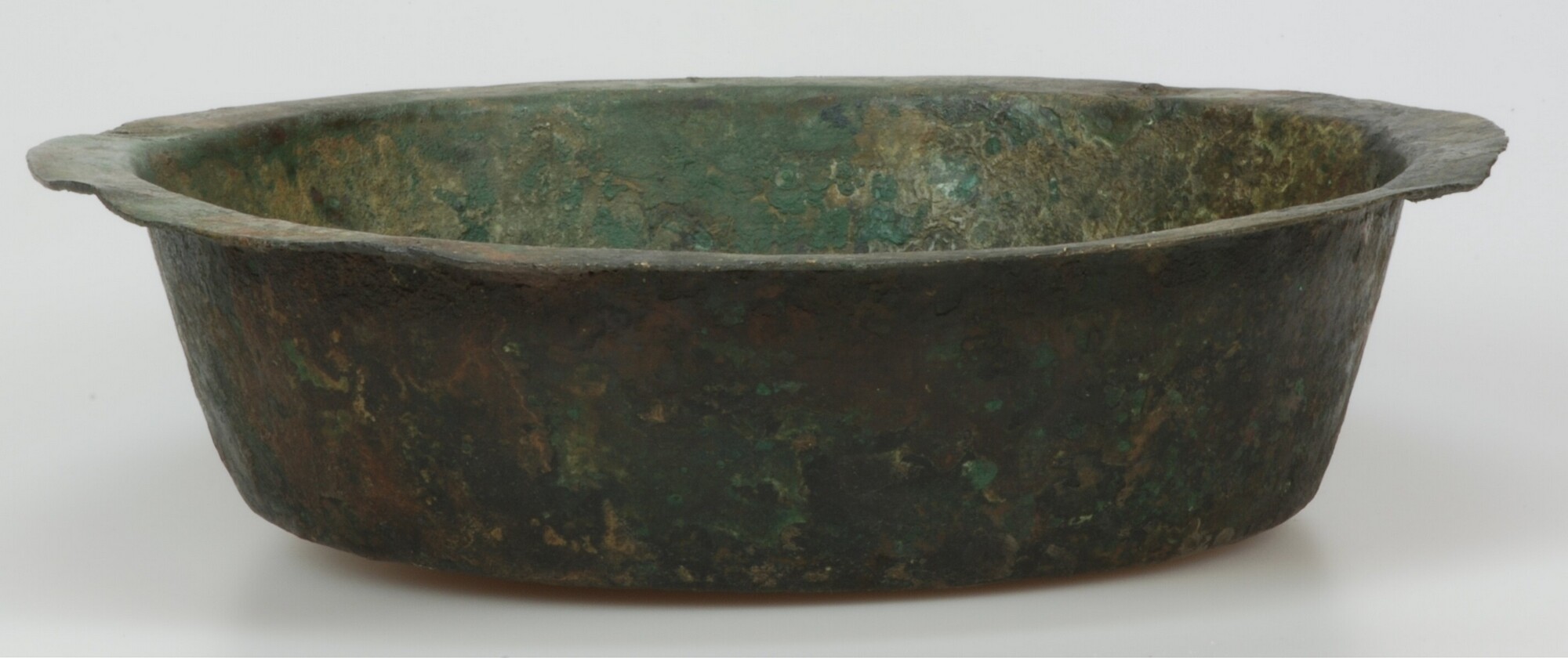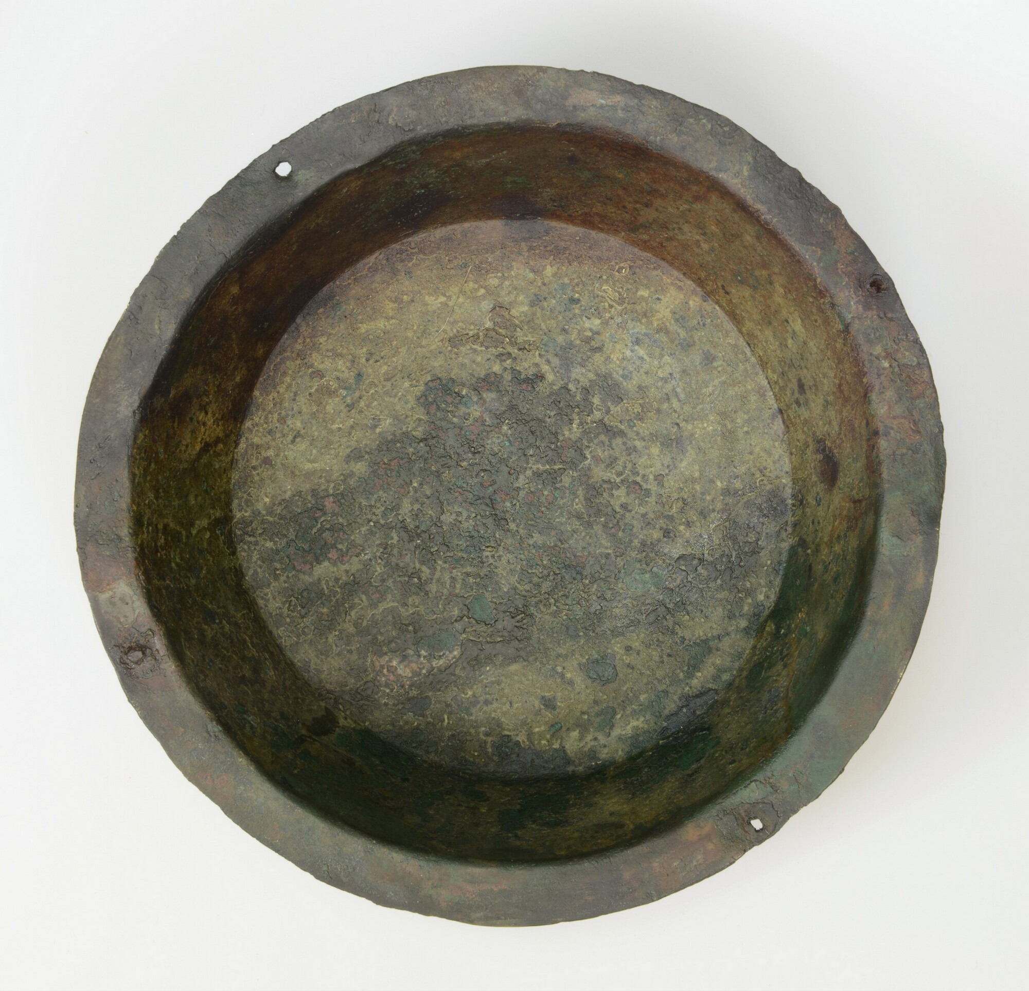 Schaal; klein formaat, rechte wand en brede kraagrand, standvlak; vier gaten in rand; onderzijde van de rand is verstevigd met een ijzeren band