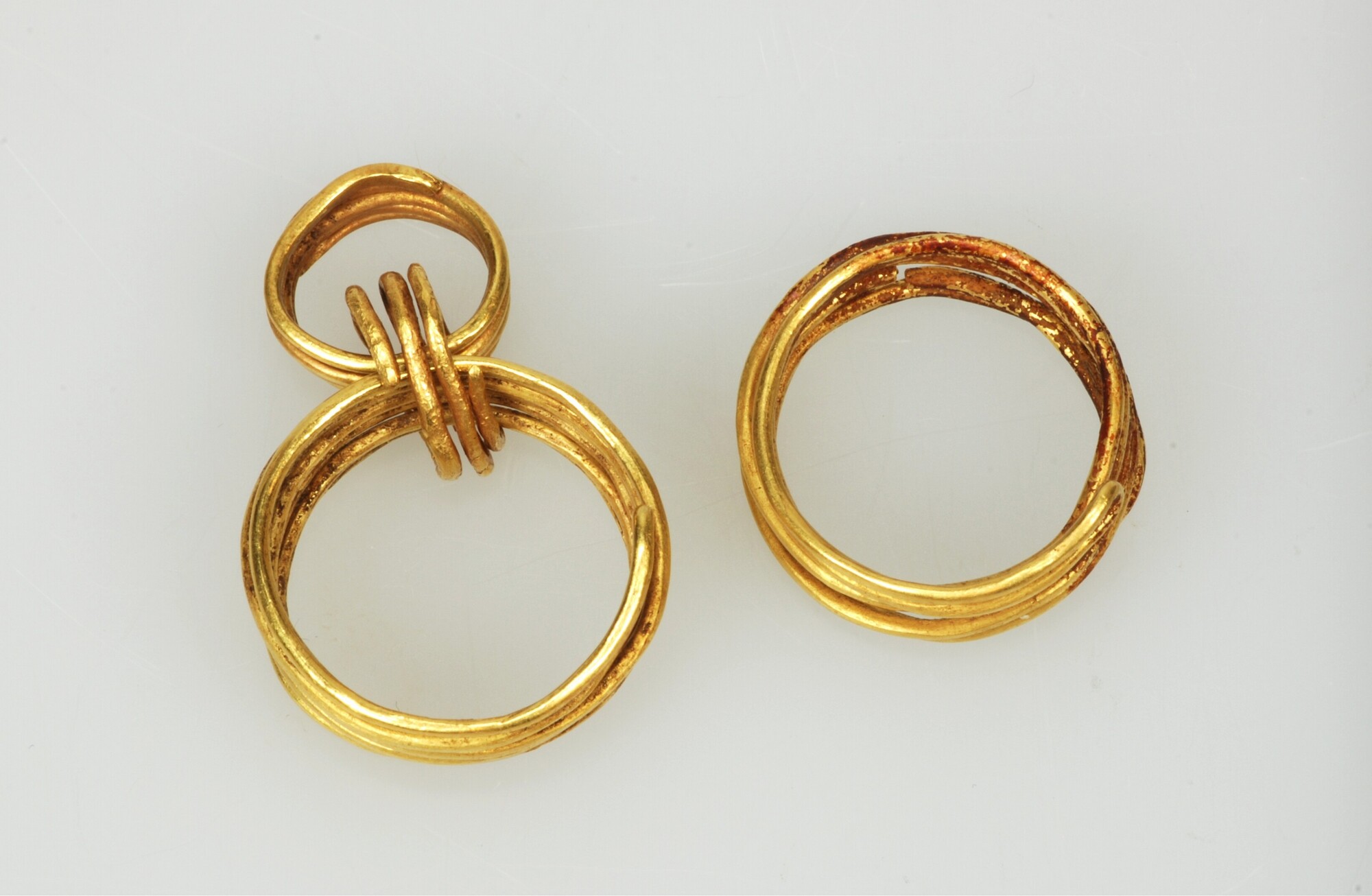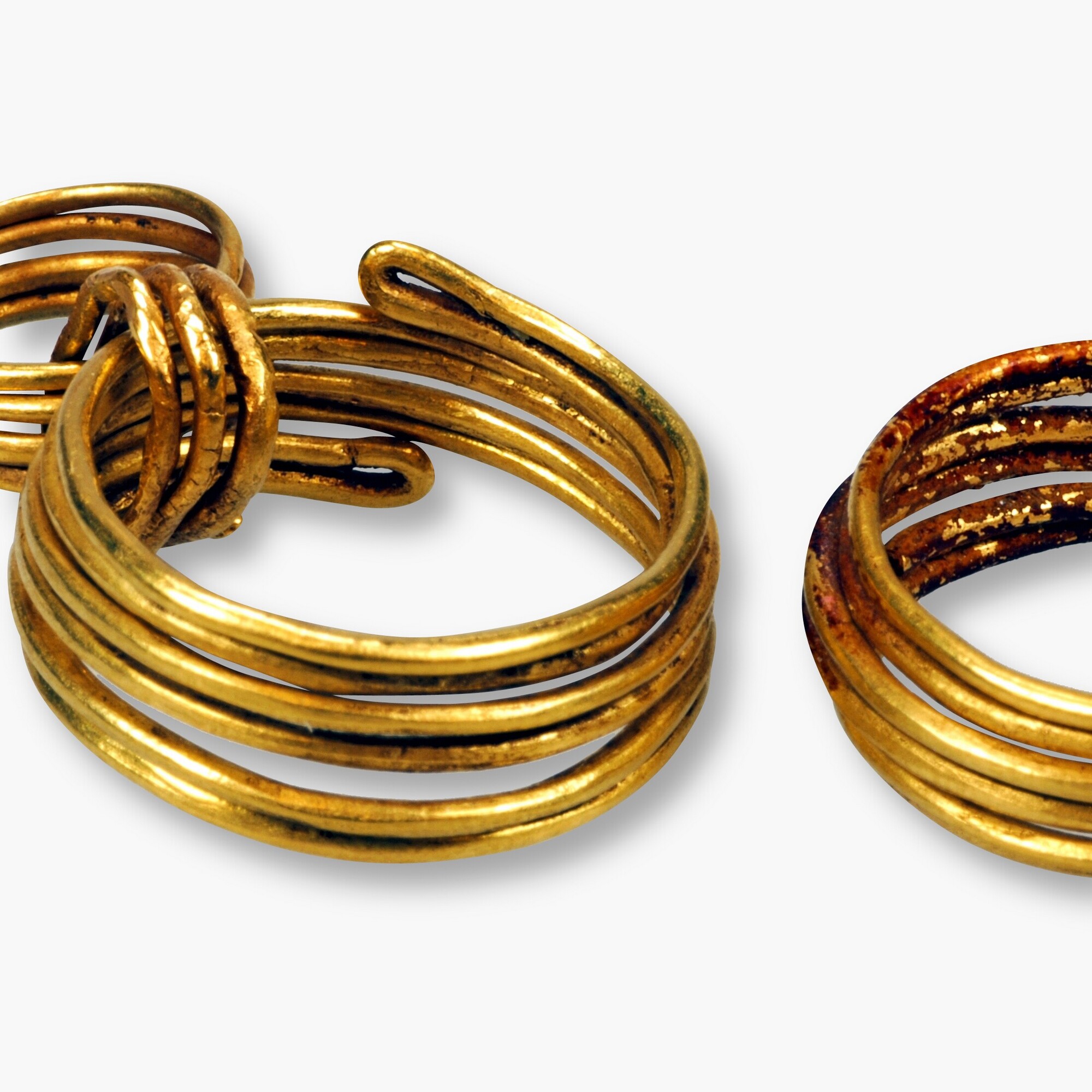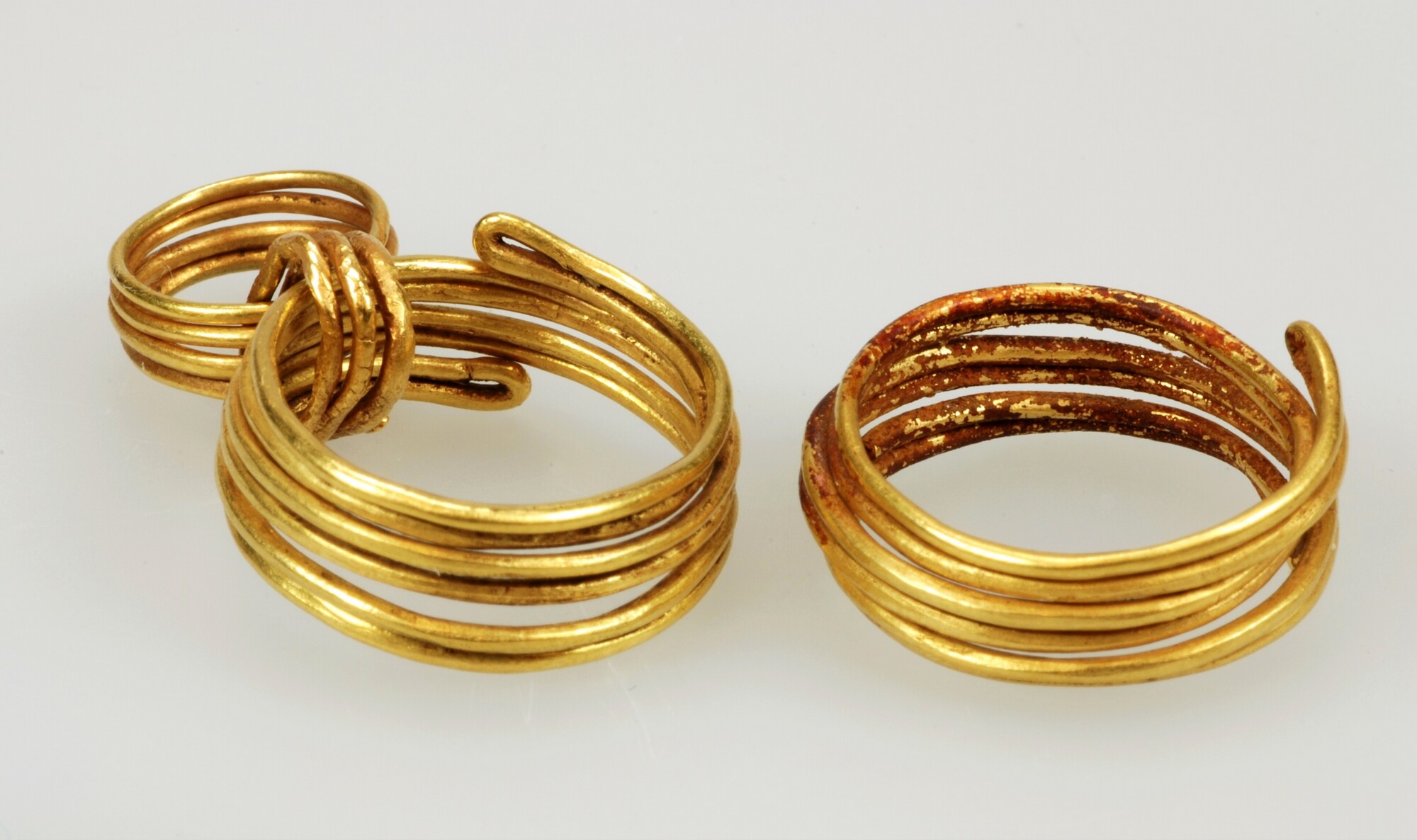 Haarsieraad; de ringen zijn van zowel enkel als dubbel gouddraad in een spiraalvorm gebogen en drie ringen zijn als schakels met elkaar verbonden; gewicht: 4.84 gram