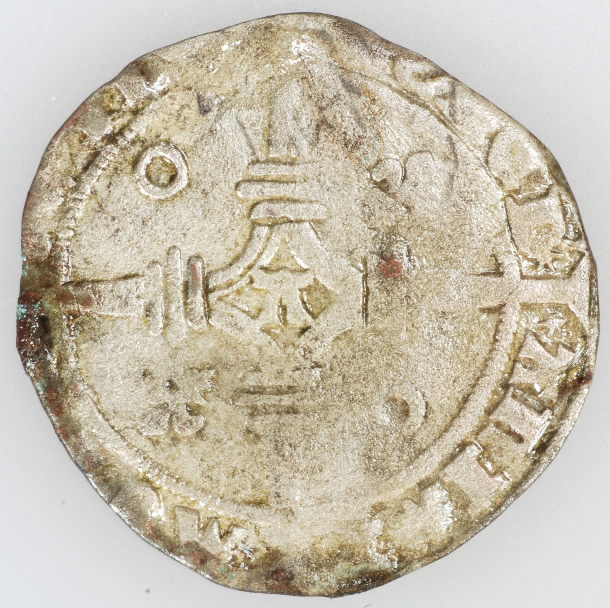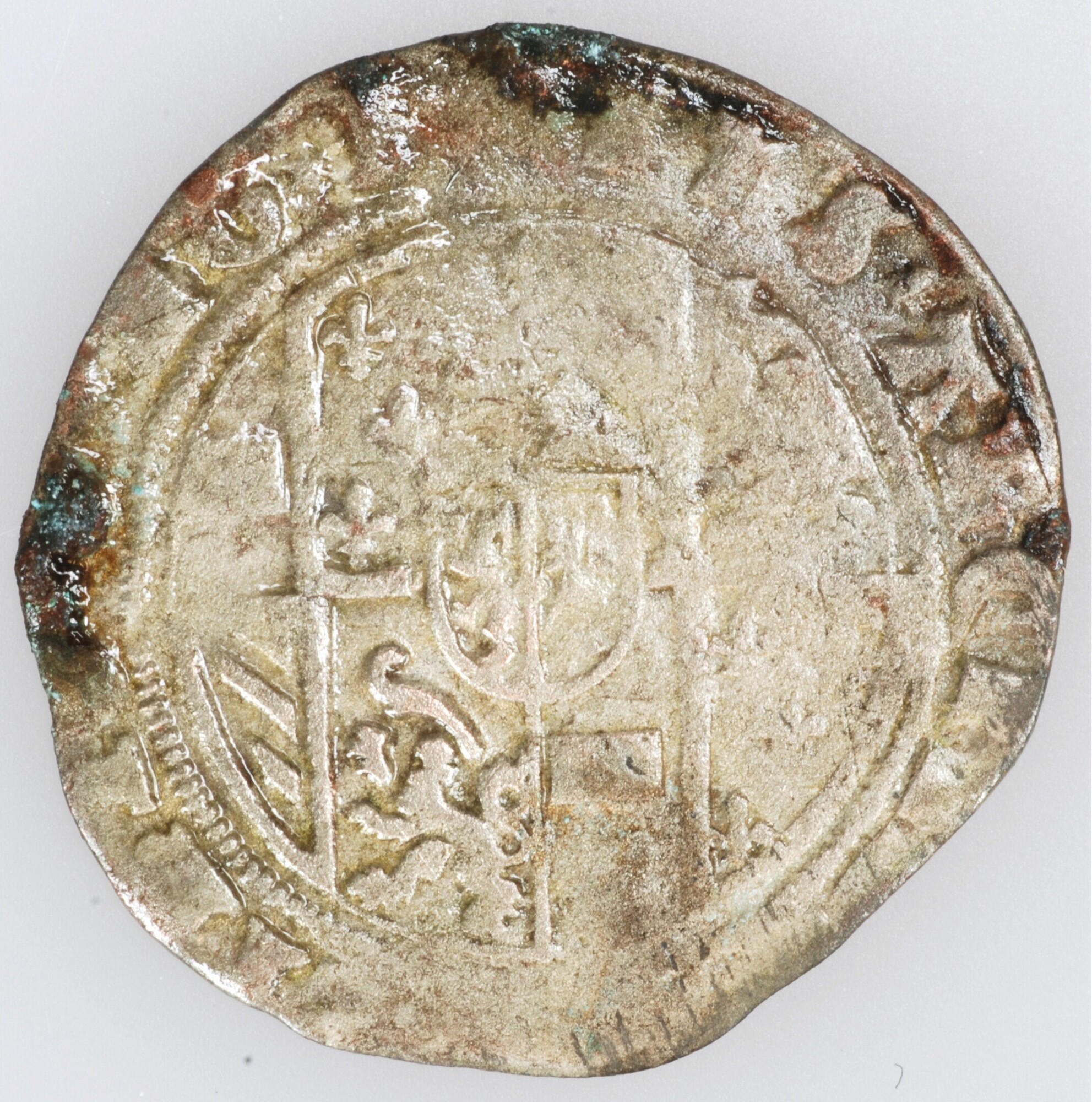 Halve Groot; Zuidelijke Nederlanden; Filips de Schone (1482-1506); vz.: Wapen van Oostenrijk-Bourgondie, randtekst: +PHS*ARCHIDVX*AVSTRIE*B(VRG)*B; kz.: lang kruis met in het hart een gotische A van de muntplaats Antwerpen, in de kwadranten 2 maal een O en 2 maal een Franse lelie, randtekst: BENED* - ANIM(A*) - MEA*D - OMINO; muntplaats: Antwerpen; gewicht:1.64 gram; vondstomstandigheden: in ...