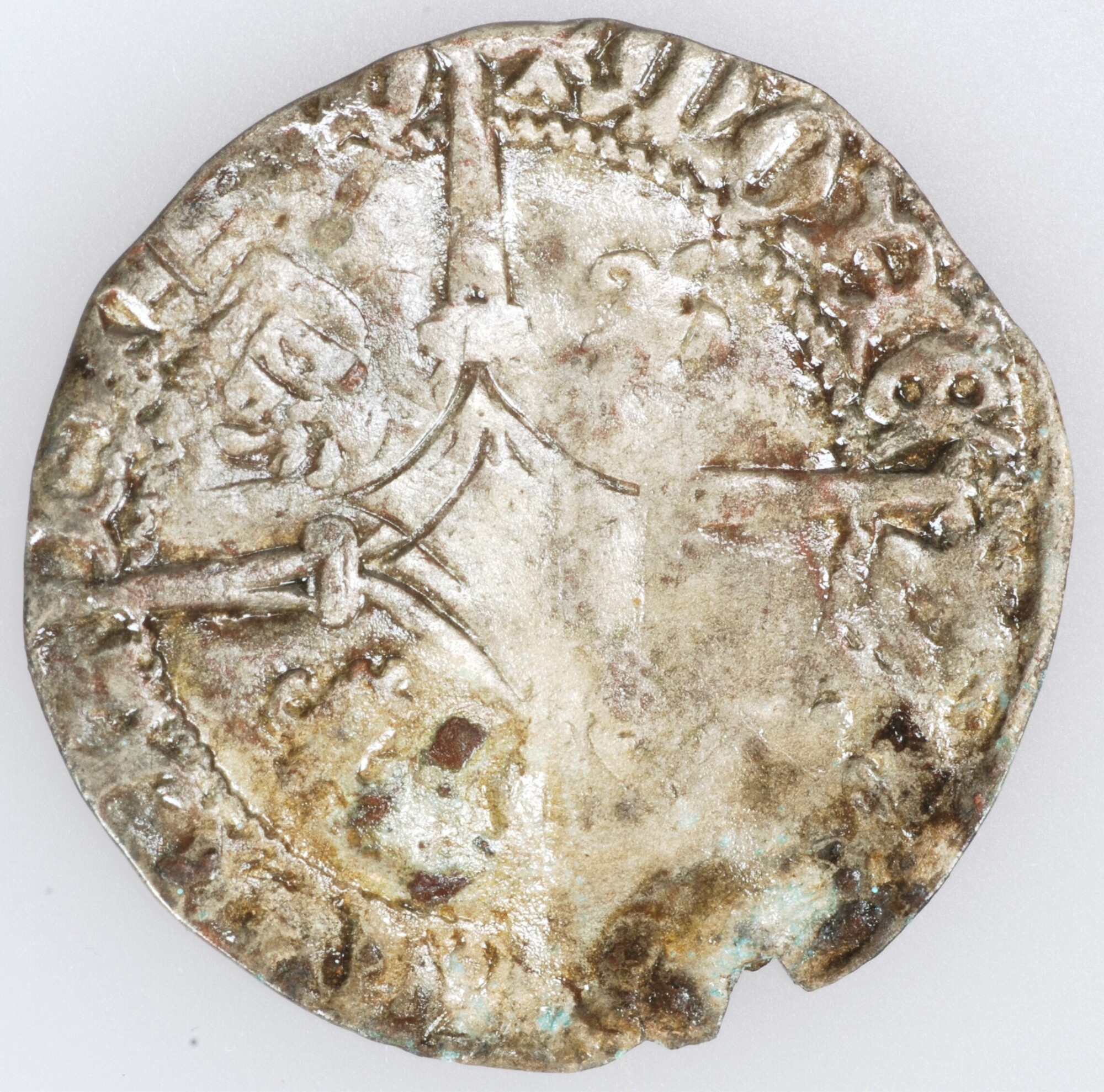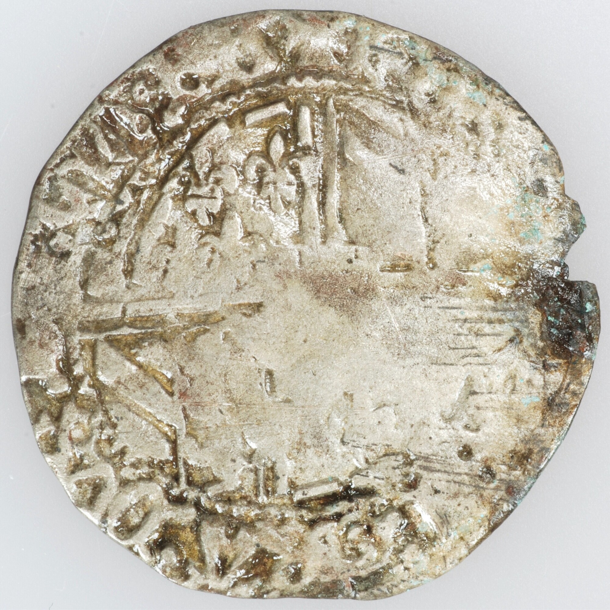 Groot; Zuidelijke Nederlanden; Karel de Stoute (1467-1477); vz.: rond gekwartierd wapen van Touraine en van Bourgondie gedeeld met Brabant, randtekst: +KAROLUS:DEI:GRAtia:DVX.BvrGvndiae:BRABantiae:Z:LIM; kz.: opengewerkt lang kruis, in het centrum een klimmende leeuw, tussen de armen leeuwen en lelies in een cirkel, randtekst: +MONETA:NOVA:DVC:BRABA; muntplaats: Leuven of Brugge; gewicht: 1.52 gram; vondstomstandigheden: in 16de eeuwse brandlaag; datum: ...
