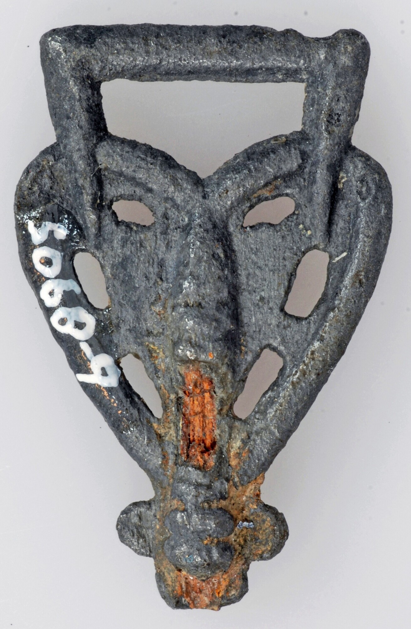 Gordelsluiting; hartvormig met rechthoekig oog aan bovenzijde; aan de achterzijde resten ijzercorrosie.