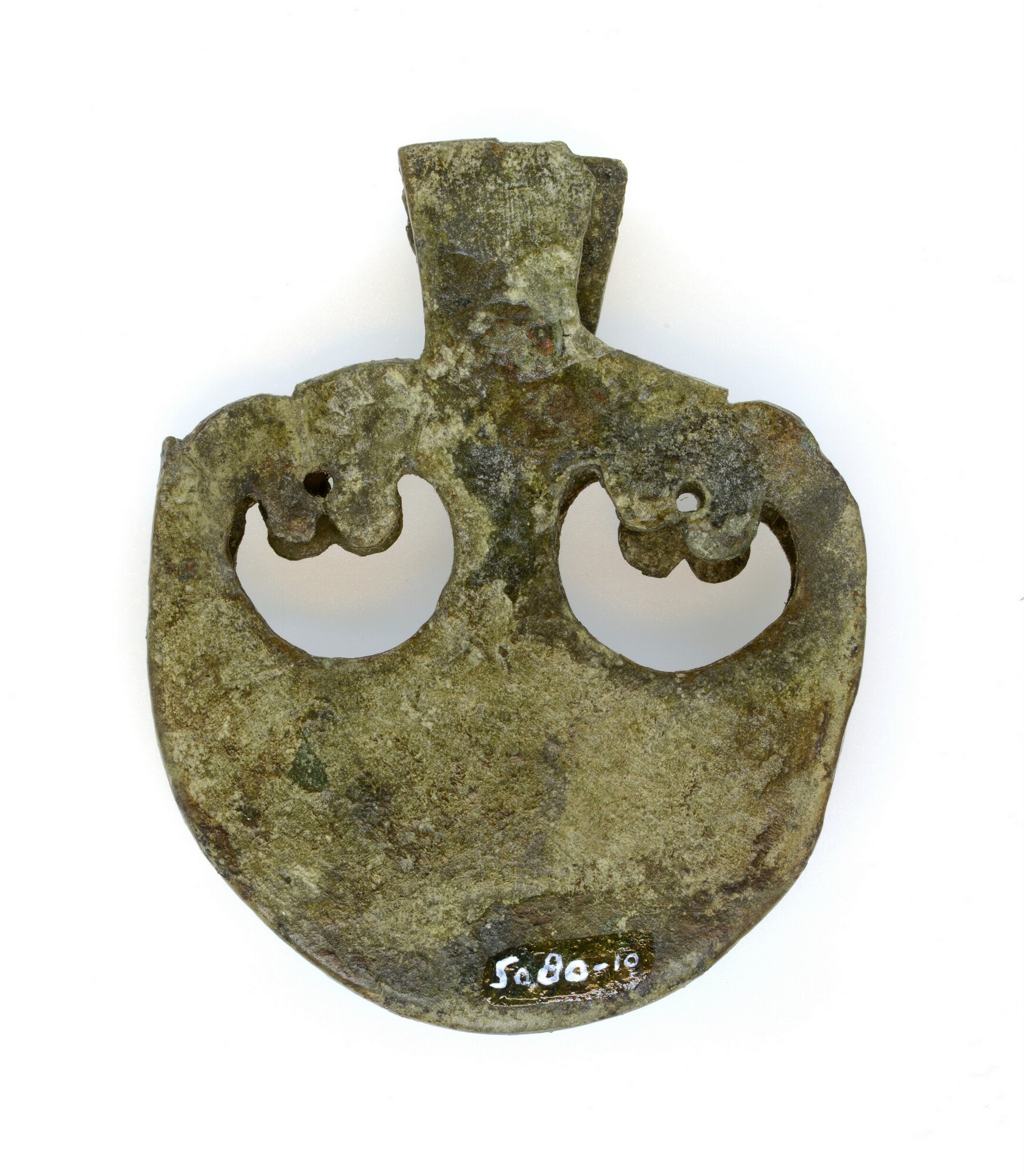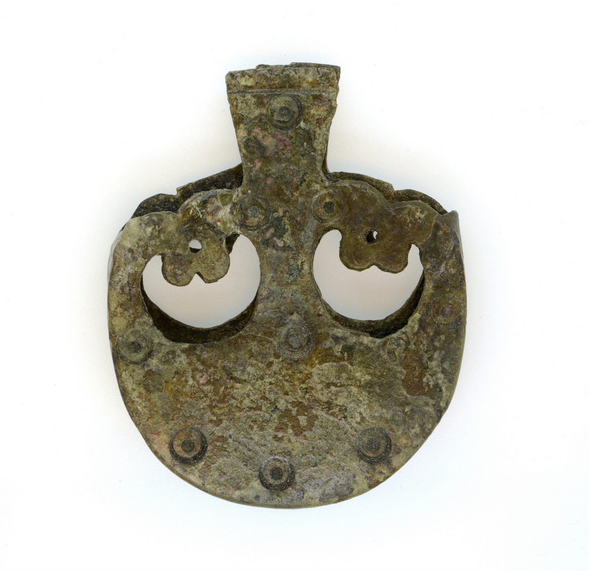 Puntbeschermer; aan de voorzijde zijn negen puntcirkels gelijkmatig over het voorwerp aangebracht. Mogelijk waren dit er oorspronkelijk elf, maar de twee overbruggende stukjes boven de pelta-vormige opening ontbreken.