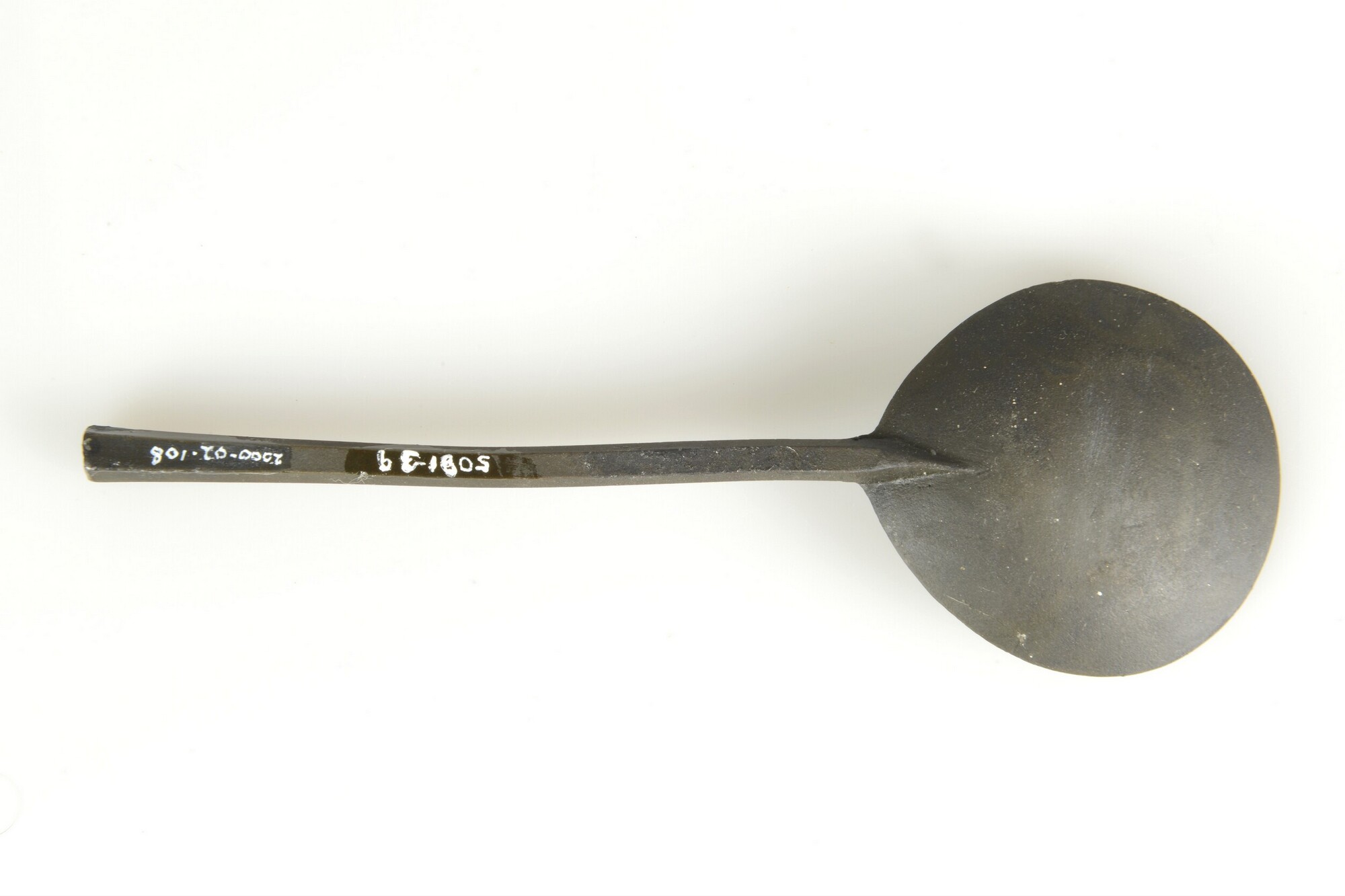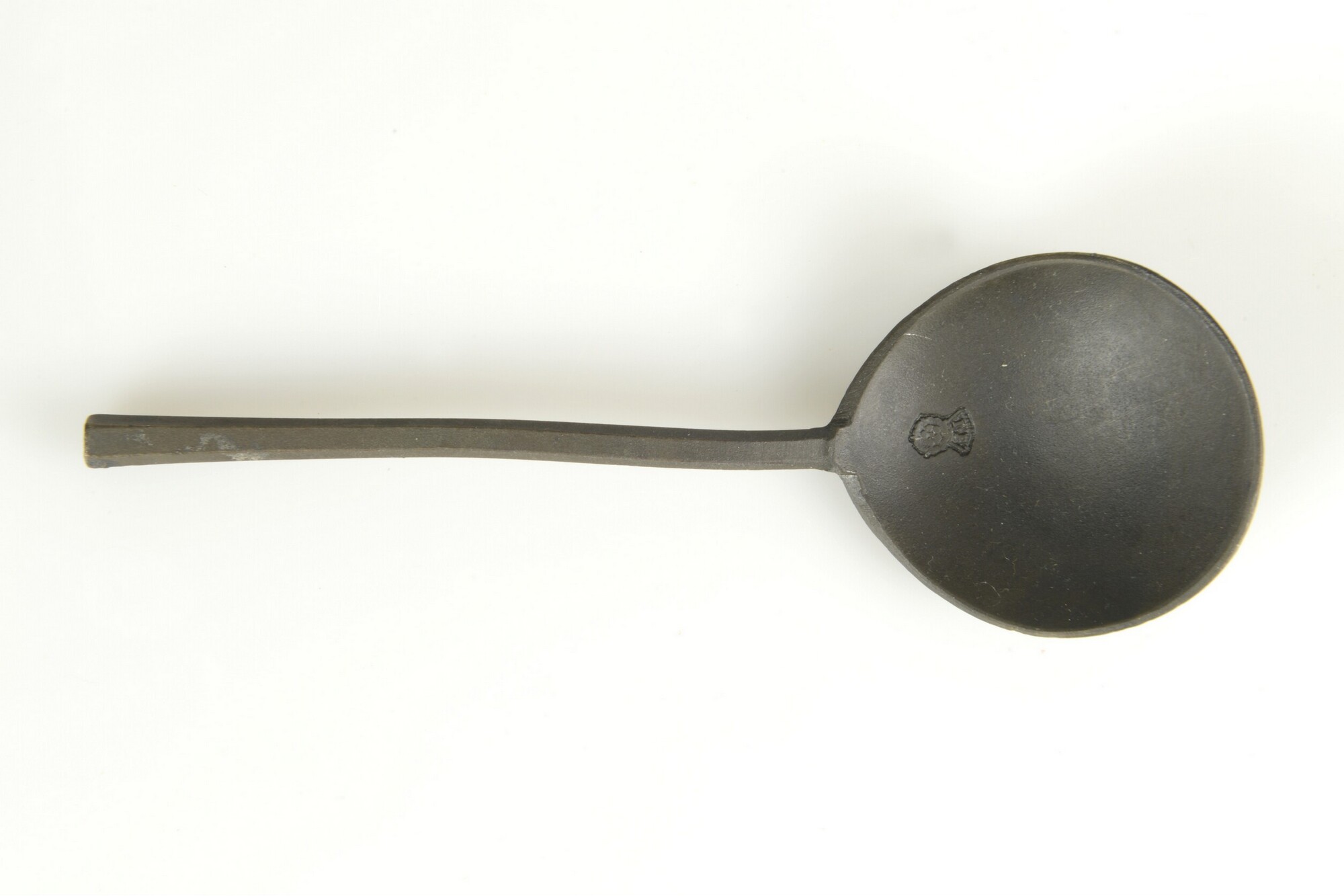 Lepel; sn-lep-; zeshoekige ovale steel; aan de achterzijde loopt de steel uit een korte naald op de bak; merk: gekroonde roos met de initialen I. P.; datum: 6 april 2000; AWP-Inv. nr.: 2000-02-106