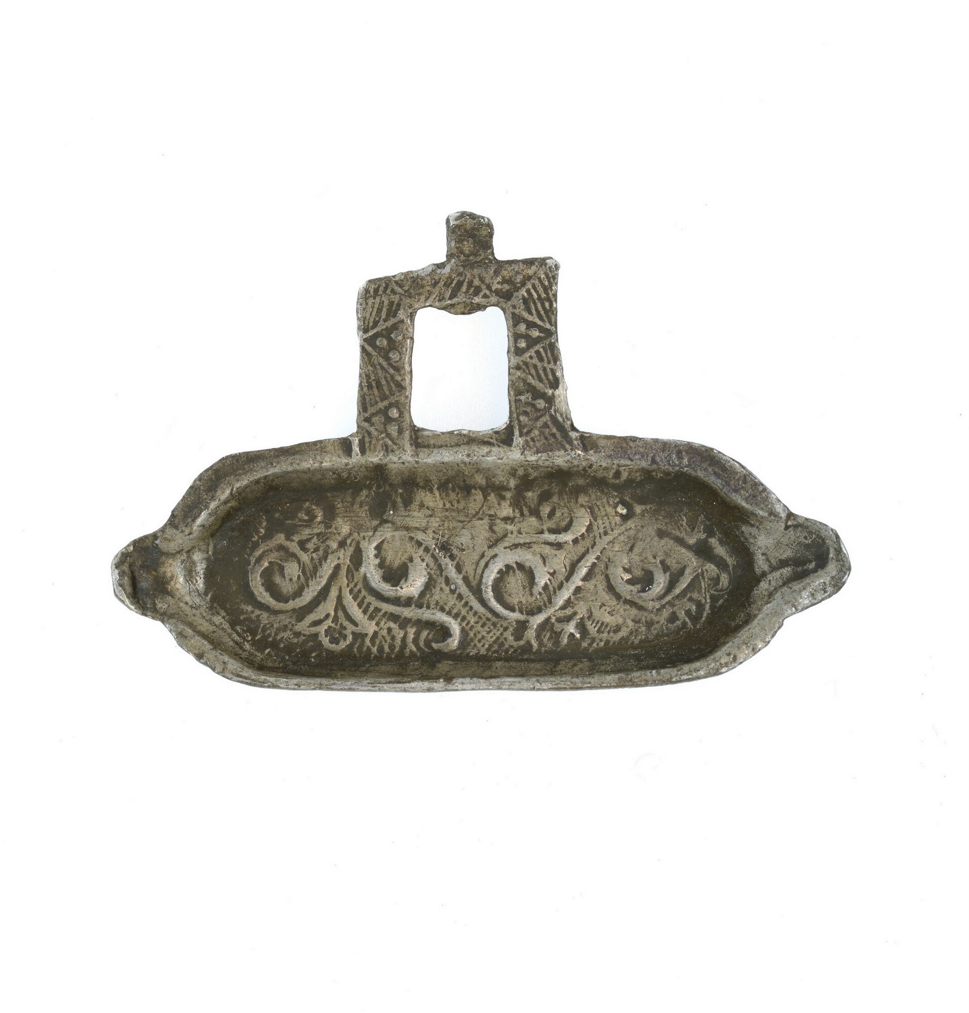 Miniatuur vetvanger; speelgoed; florale motieven in de rechthoekige bak; aan weerszijden schenklippen; rechthoekig handvat