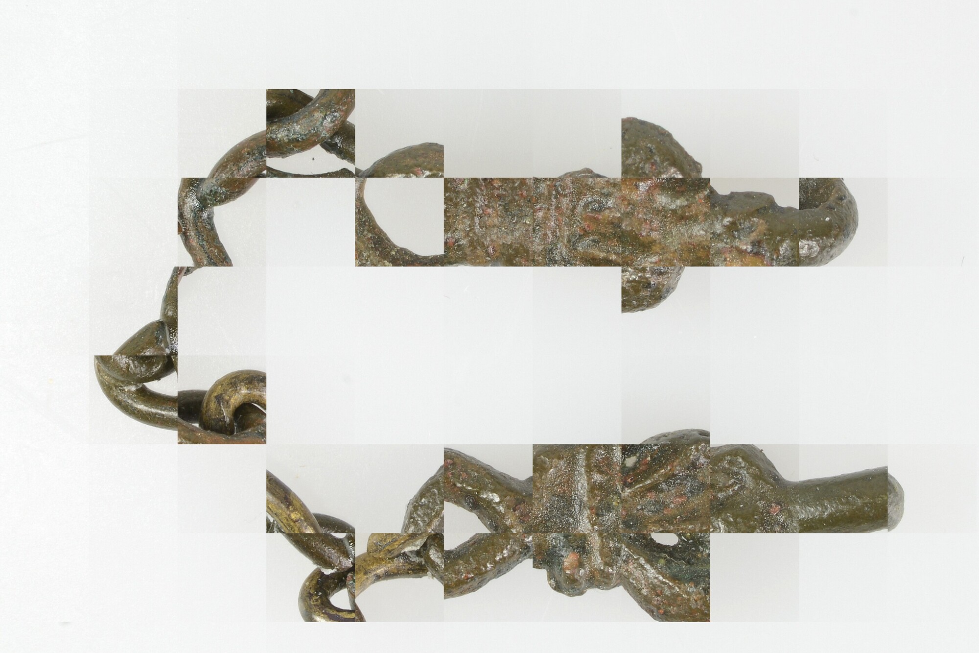 Twee kledinghaken met een ketting ertussen (kettingsluiting); rond oog