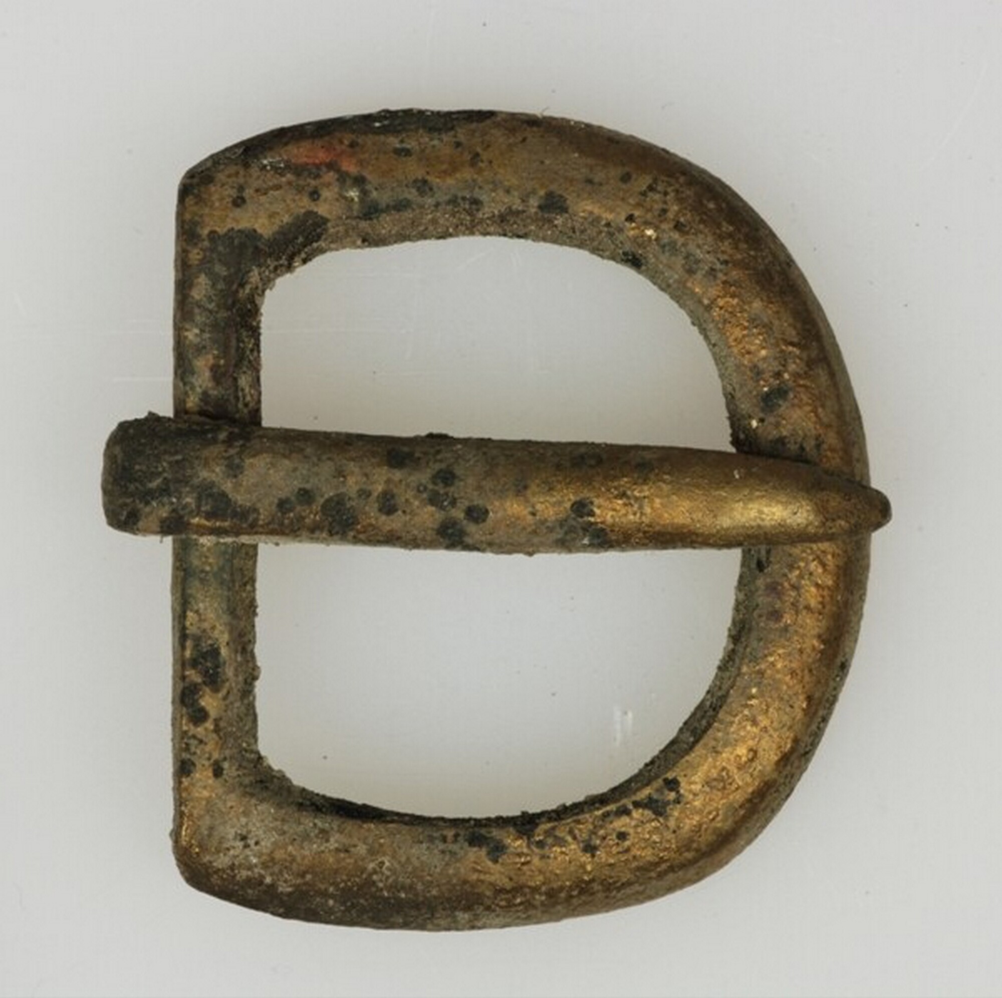Gesp; cz-ges-; gegoten; met angel; D-vormig; vondstomstandigheden: vlak achter beschoeiing (18de eeuw)