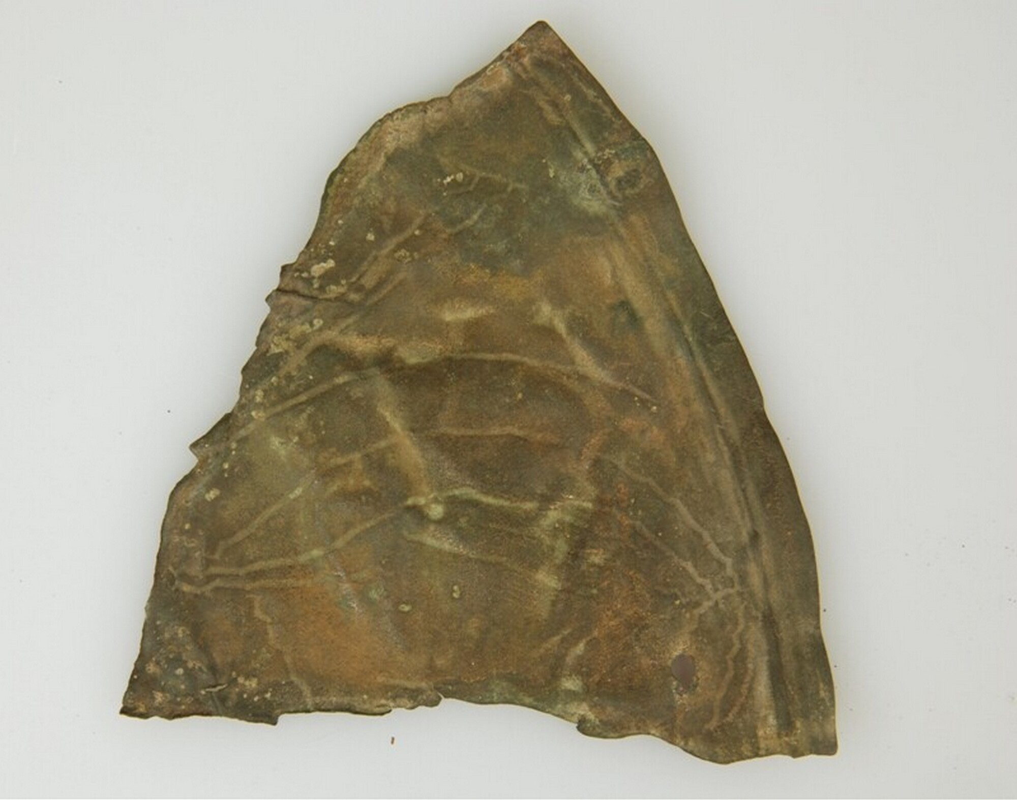 Hanzeschotel; het fragment is platgeslagen. De oorspronkelijke rand was 6 mm breed. De wand is met een bijna 1 mm brede stift gegraveerd met lijnen, die een neiging tot zigzag hebben; vondstjaar: 1984