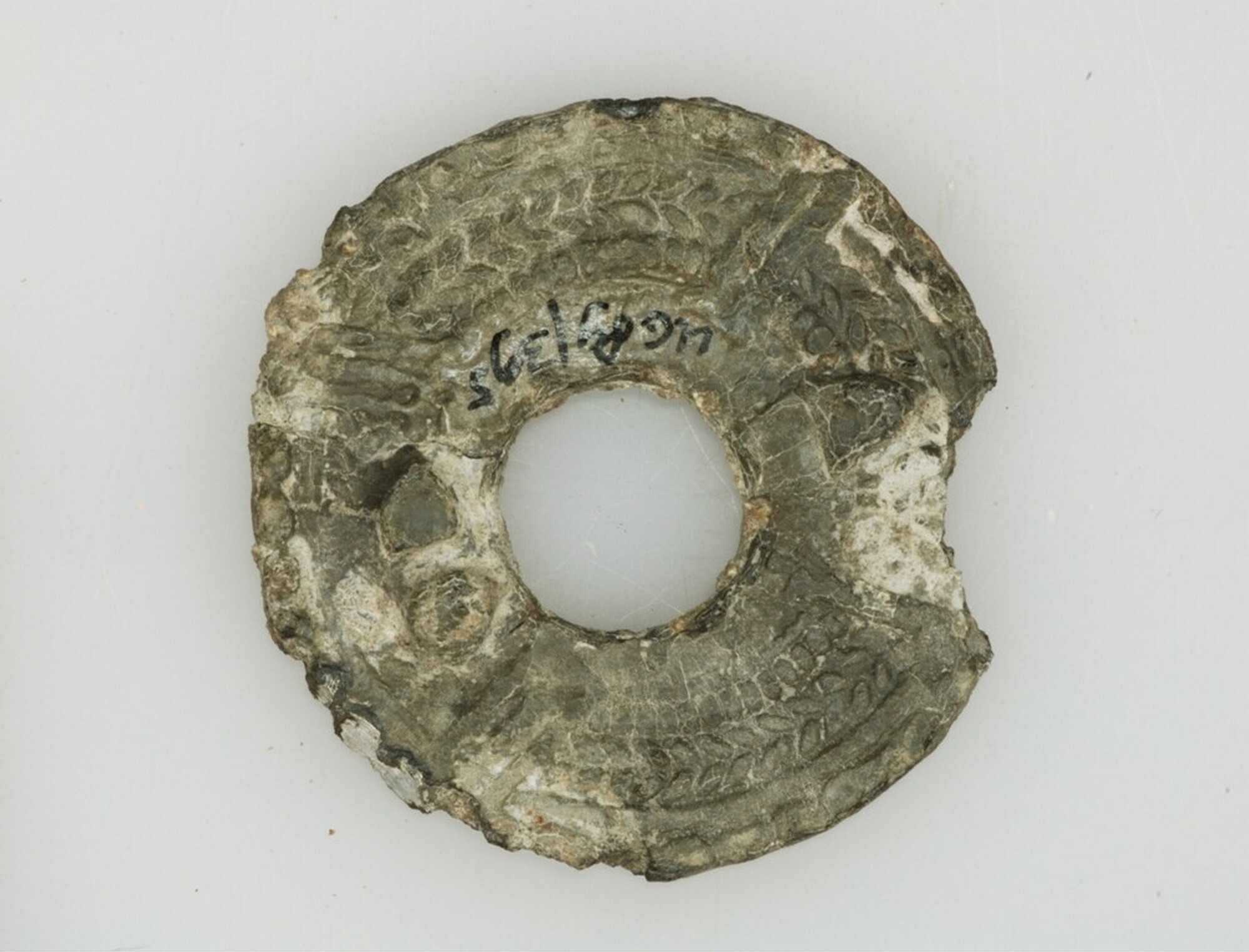 Pseudo-muntfibula; centrale doorboring. Het object is uit een stuk gegoten en heeft aan de achterzijde een aangesoldeerde naaldhouder waarvan de naald ontbreekt. De rond het middenstuk lopende versiering bestaat uit een parelrand, een cirkelrand, een vlechtrand en 2 parelranden. Aan de achterzijde lopen hier straalsgewijs vier dwarsbanden overheen. Het randschrift aan de voorzijde wordt gevormd ...
