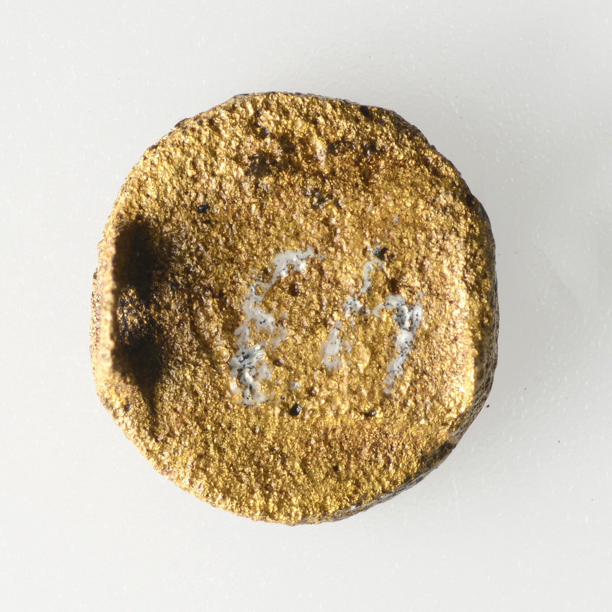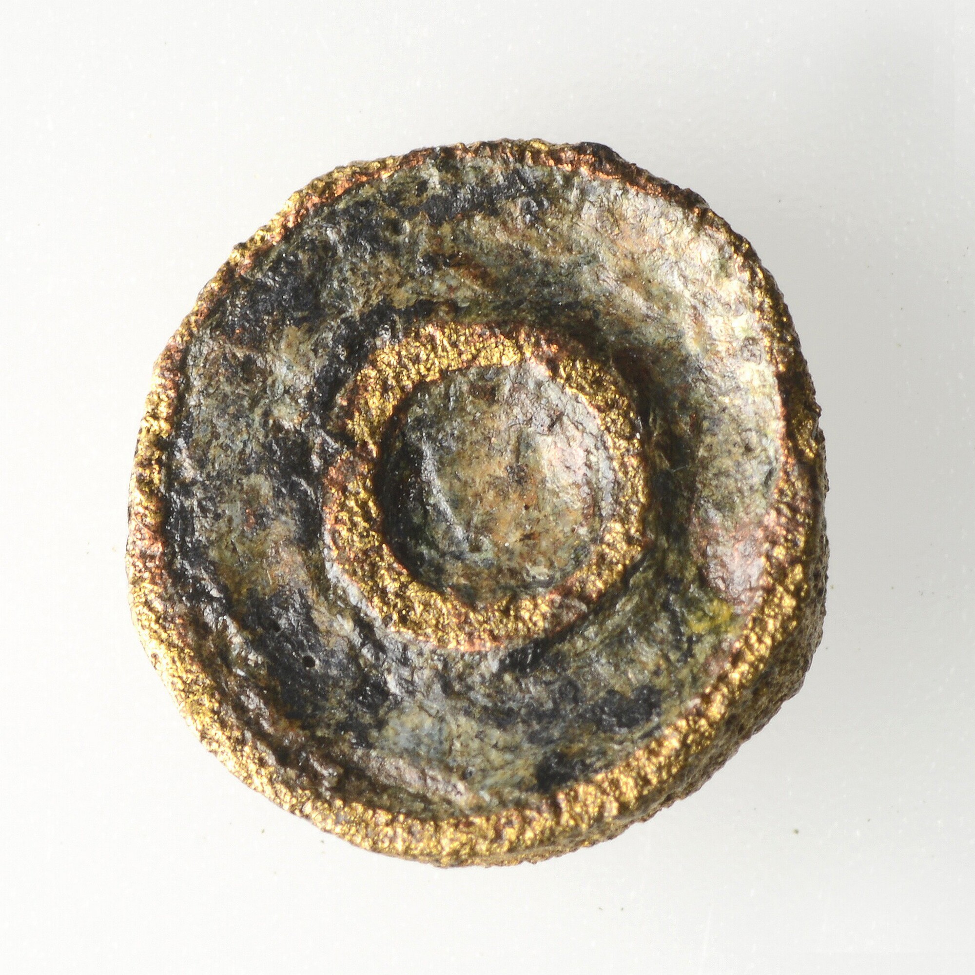 Schijffibula; Nabenemailscheibenfibel, kleine schijffibula met oog-haakconstructie met inlegwerk van wit en rood email; resten bevestigingshaak en -oog aan de achterzijde.