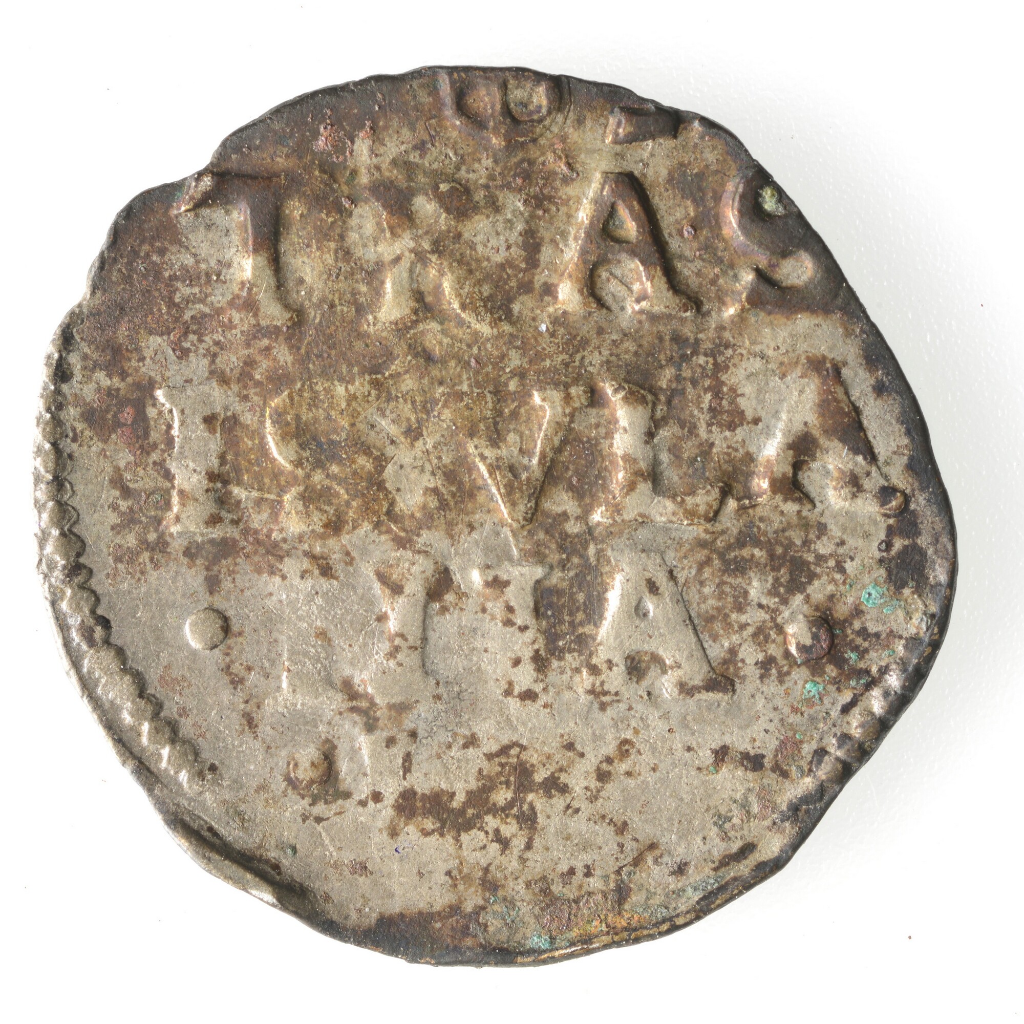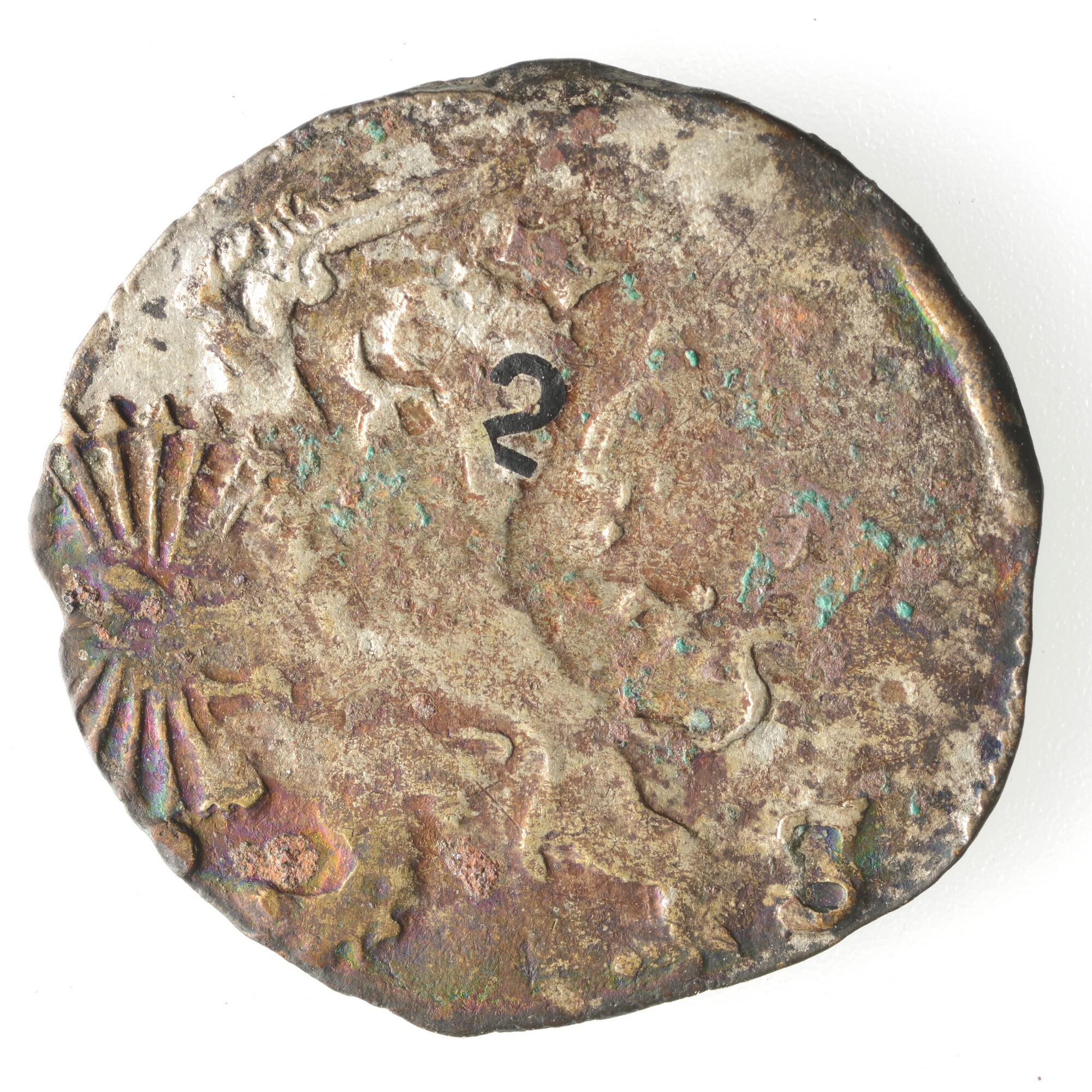 Dubbele stuiver; Overijssel provincie (1581-1795); vz.: in drie regels TRAS / ISVLA / NIA; kz.: leeuw met zwaard en pijlenbundel tussen 2 S; gewicht: 1.46 gram