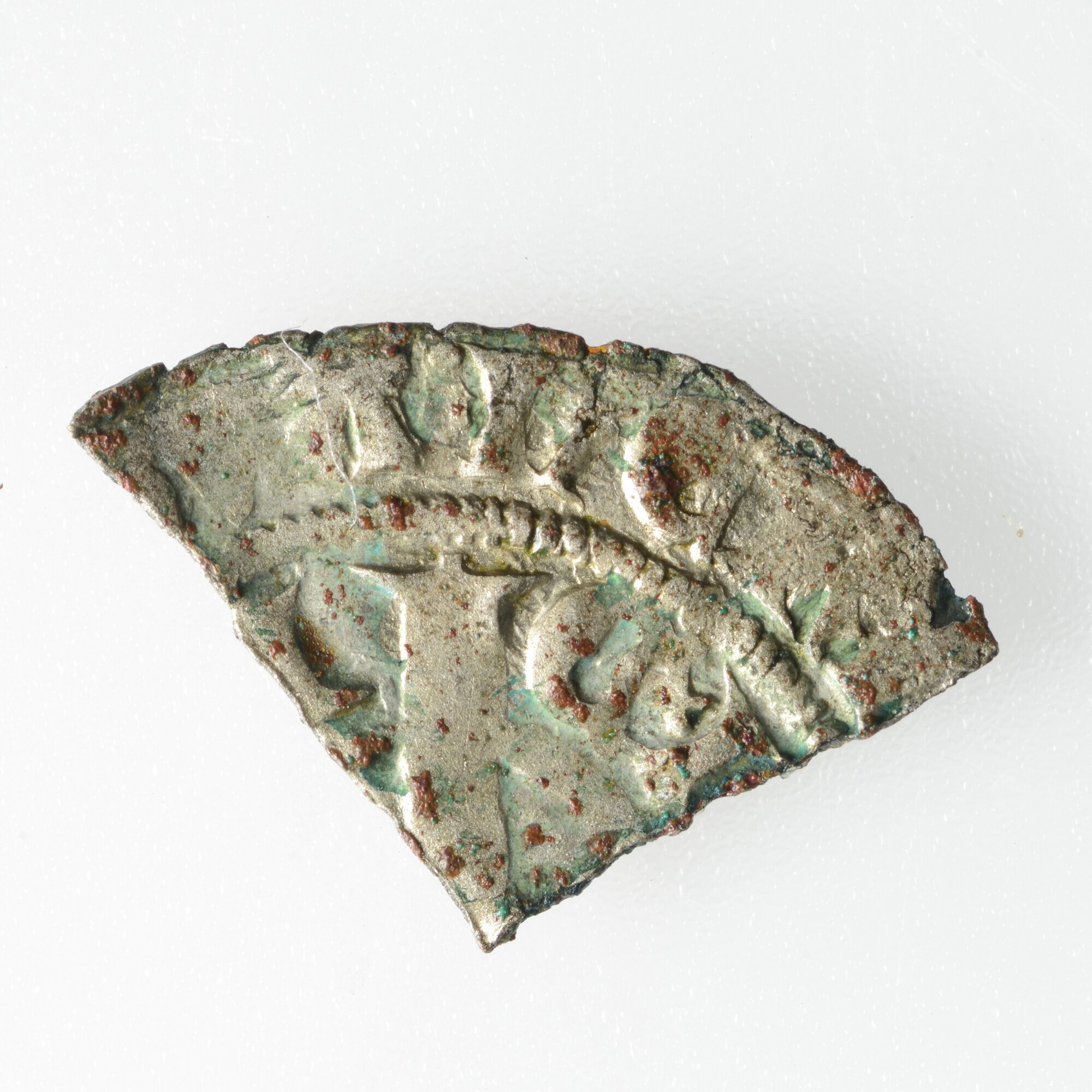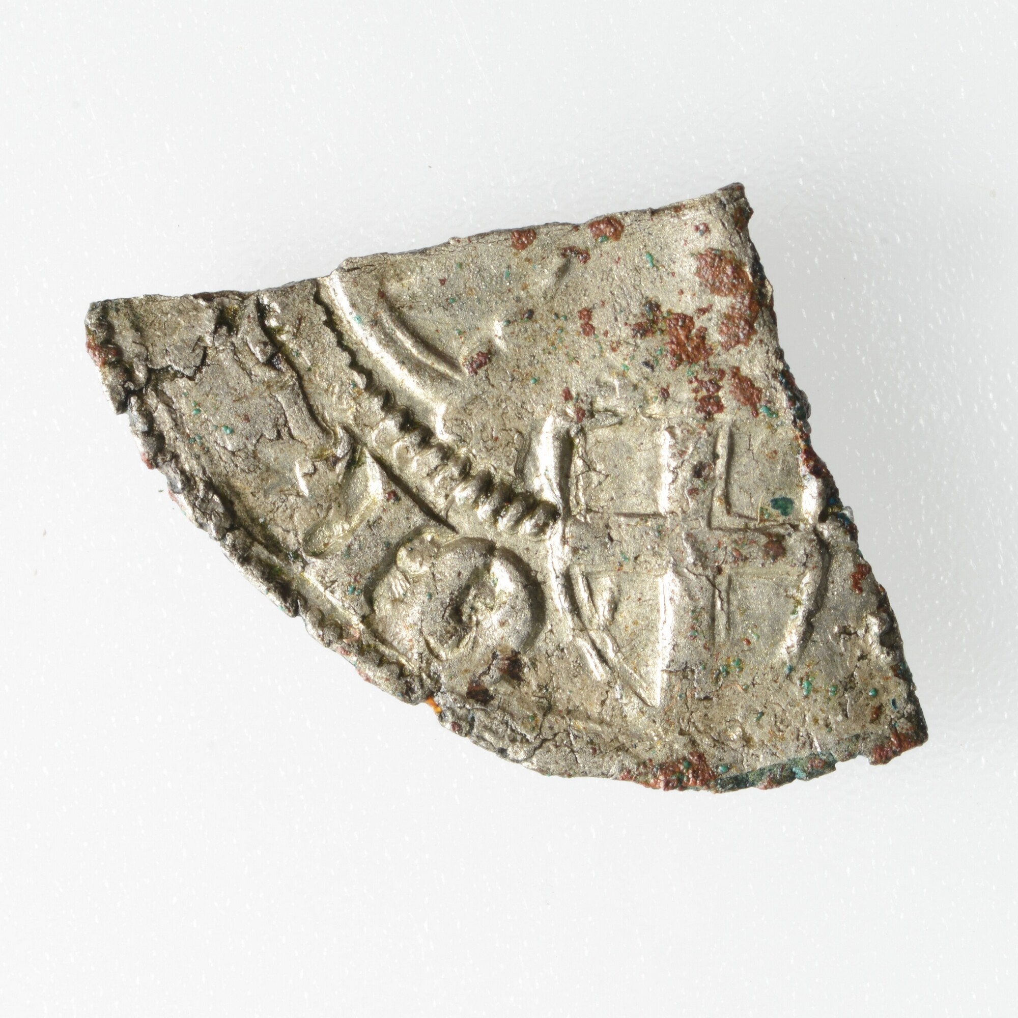 Kwart groot Bisdom Utrecht; Arnold van Hoorne (1371-1379); vz.: klimmende leeuw? naar links binnen parelcirkel, met omschrift; kz.: middellang gevoet kruis binnen parelcirkel, met omschrift binnenste rand; gewicht: 0.19 gram; muntplaats: Harderwijk ; referentie: vdChijs XII. 5-6