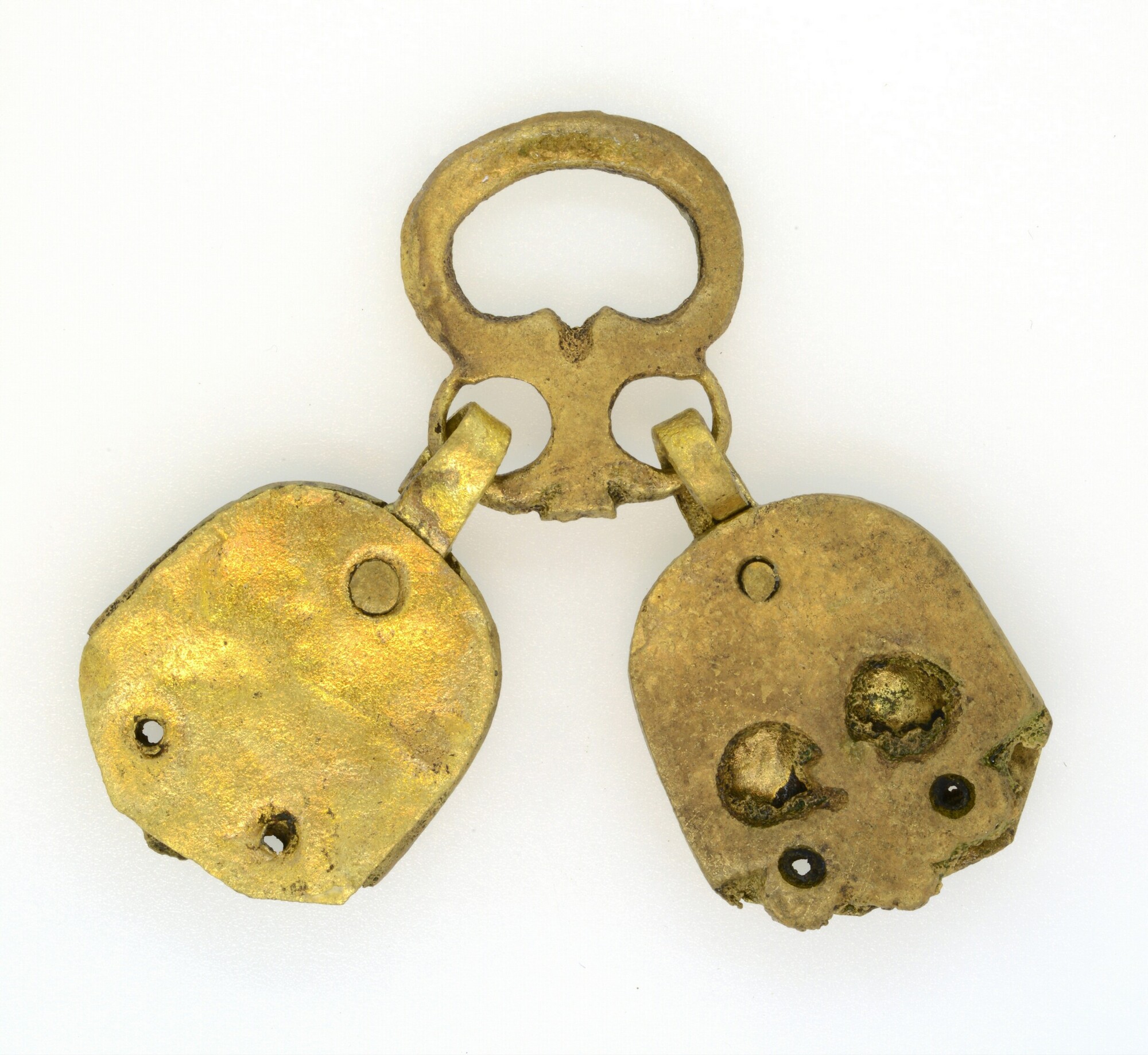 Gordelsluiting; driedelig: middenstuk met twee oogjes waar twee versierde beslagplaatjes aan bevestigd zitten; sectie: 5, laag: 10, diepte: 1.5, vondstomstandigheden: puinlaag sloot, datum: 18-5-2005