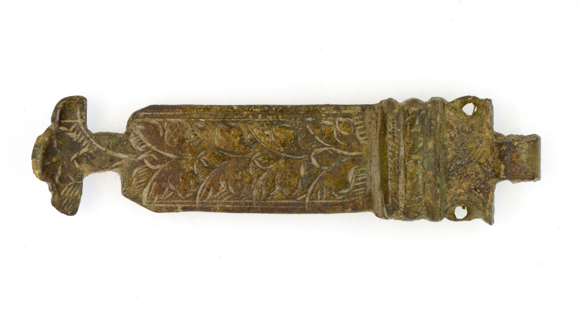 Gordelsluiting; sluiting met T-vormige haak; versierd met floraal graveerwerk, zaagsnedes en vijlwerk; twee gaten aan één zijde; sectie: 6, laag: 0, diepte: 1, datum: 23-5-2005