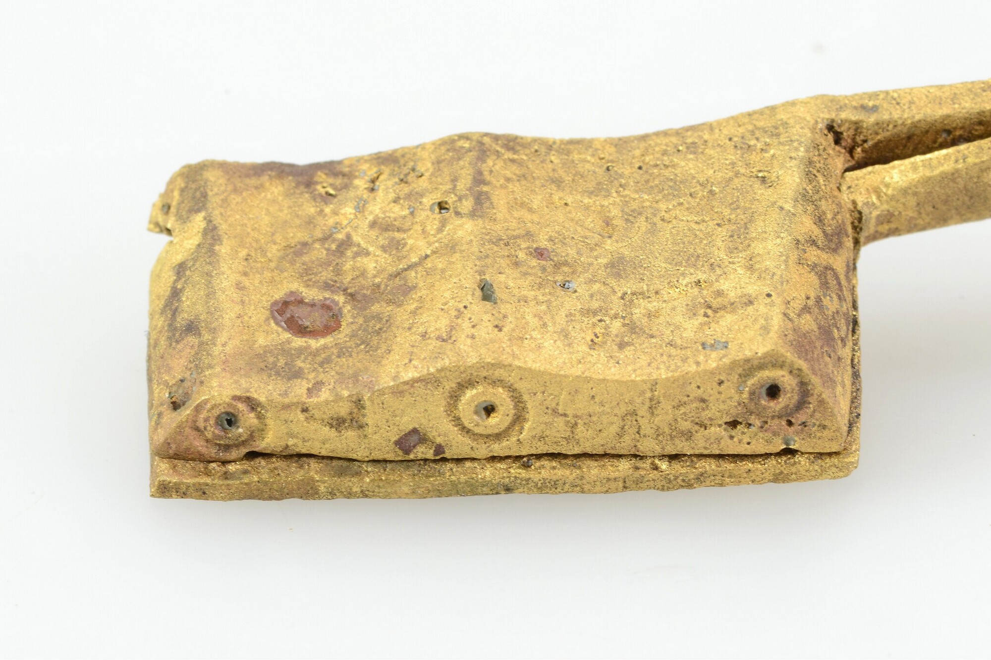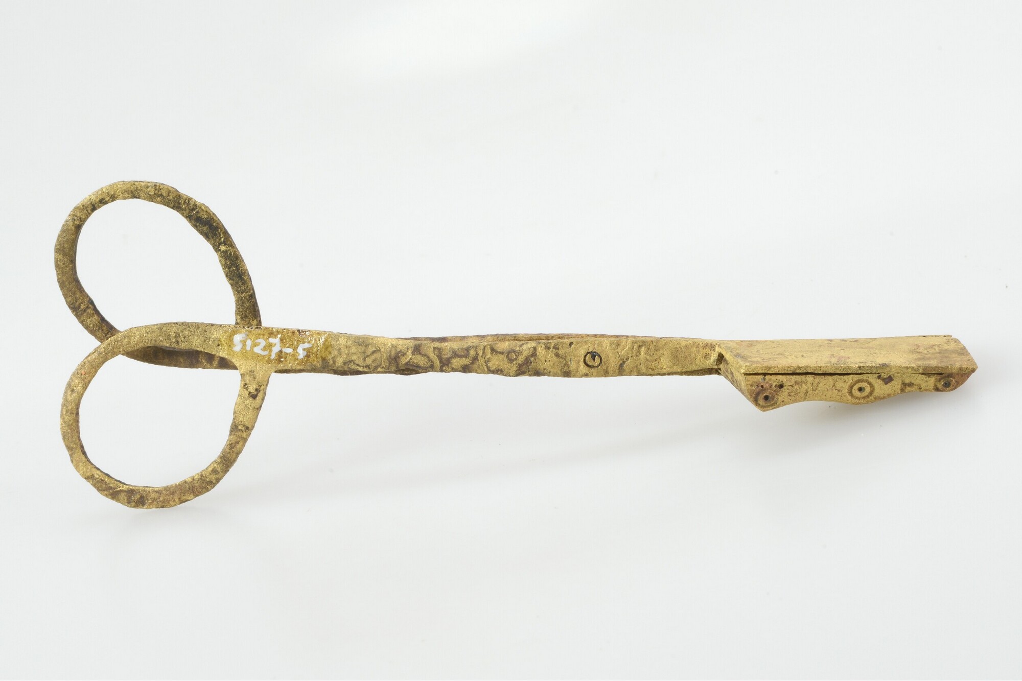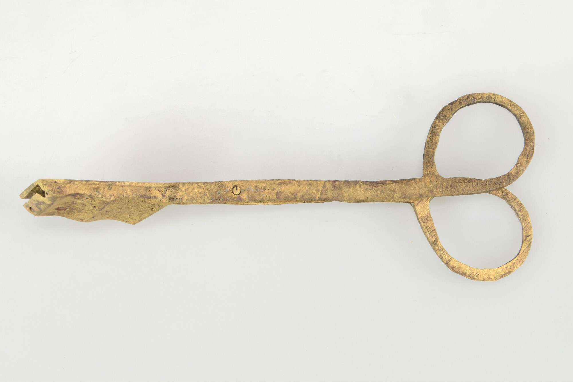 Kaarsendover; rechthoekige pittendoos welke ter decoratie is versierd met drie puntcirkels. De twee helften zijn met een messing klinknagel aan elkaar verbonden