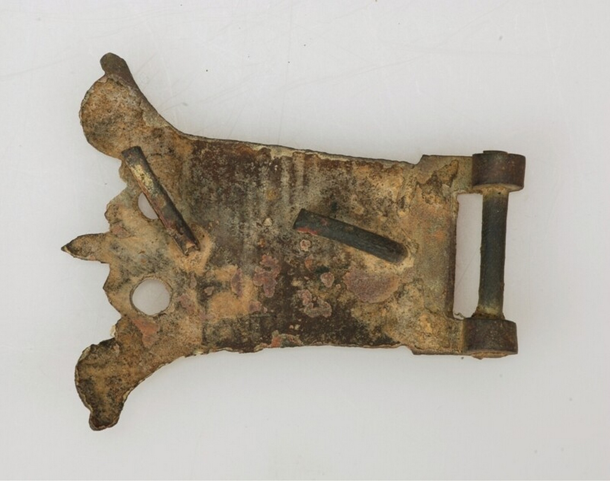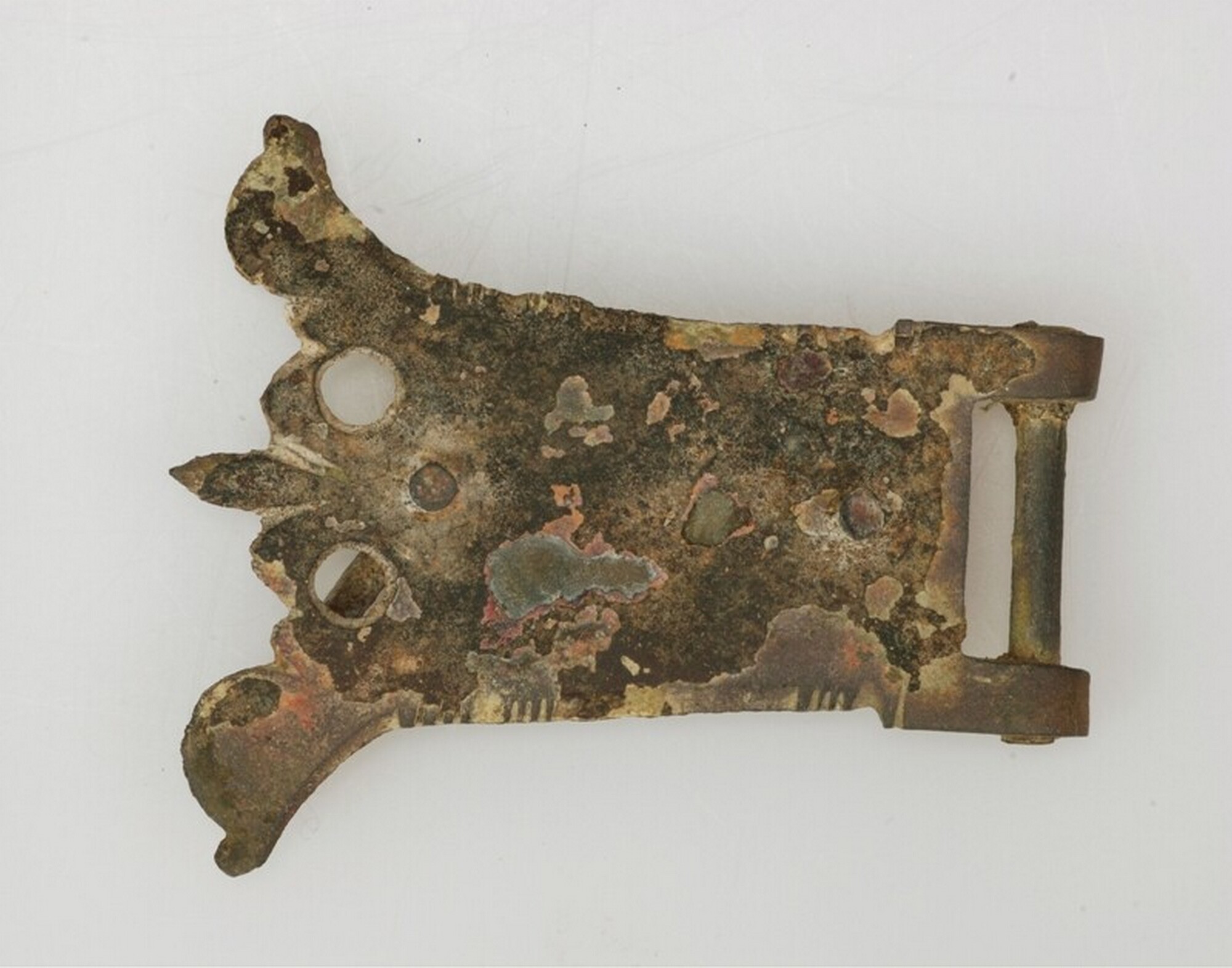 Boekbeslag; muiter; gemaakt uit messingplaat en voorzien van twee bevestigingsgaten. Afkomstig van een sluiting met sluithaak en -lip. Versierd met vijlwerk, zaagsnedes en twee gaten