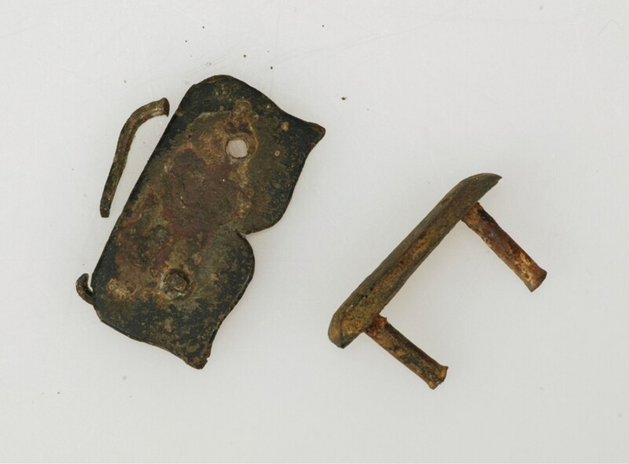 Boekbeslag; borgplaat; twee borgplaatjes waarvan er één is versierd met vijlwerk en twee bevestigingsgaten met nagels. Het andere borgplaatje is rechthoekig met twee bevestigingsnagels