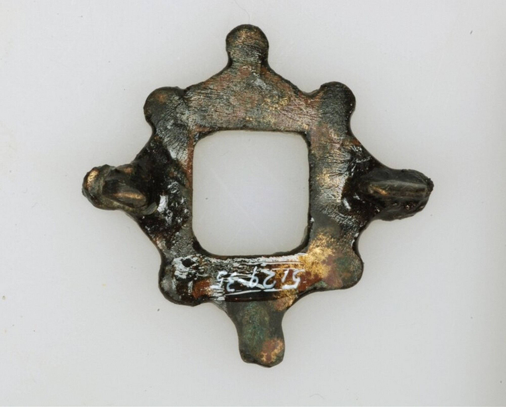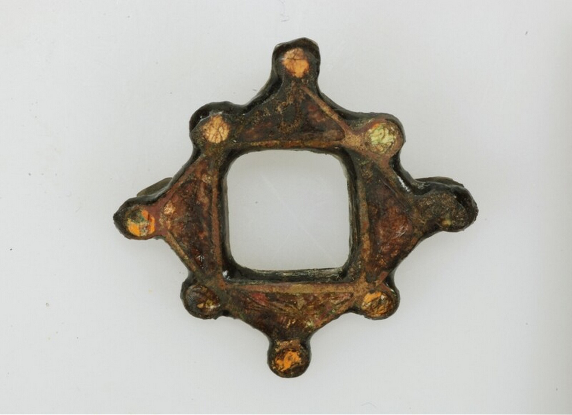 Figuurfibula; opengewerkte vierkante schijffibula met acht halfronde uitsteeksels; de driehoekige siervelden van de centrale schijf zijn rood geëmailleerd, de kleine uitsteeksels geel of oranje