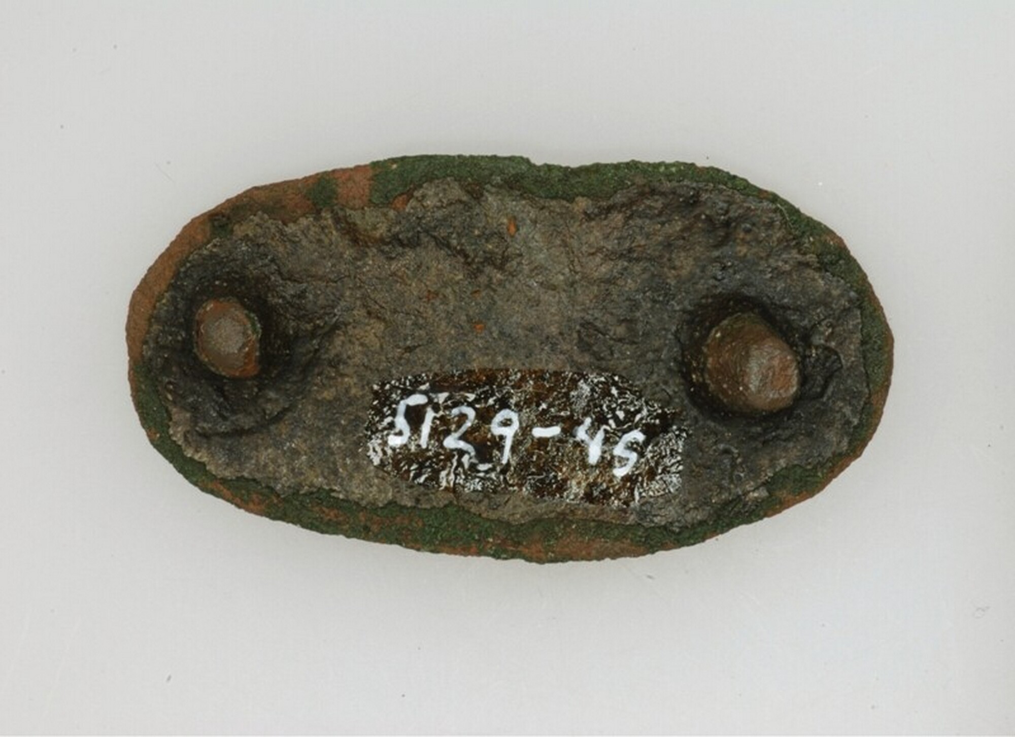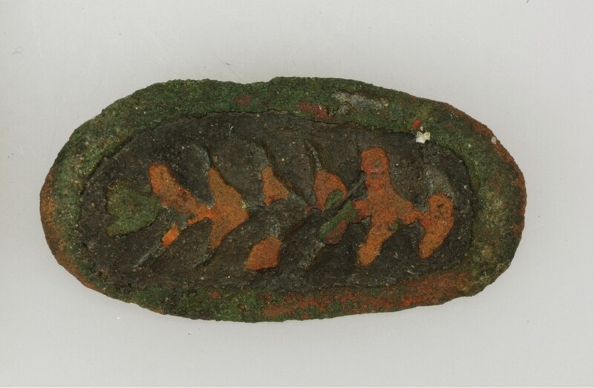 Schijffibula; ovale fibula met visgraatmotief. Rood geëmailleerd en voorzien van twee klinknagels