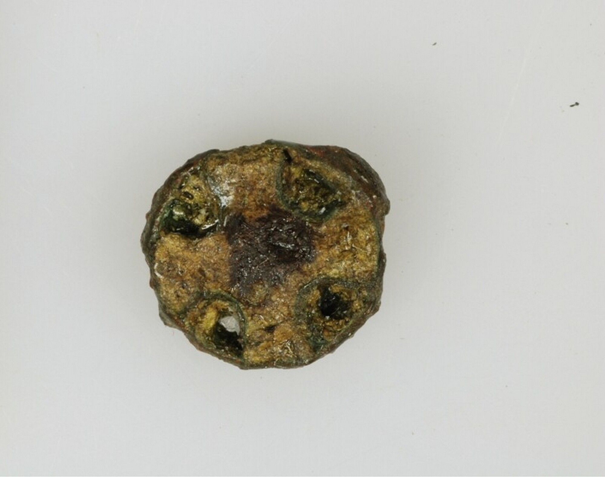 Schijfibula; kleine schijffibula met oog-haakconstructie, met inlegwerk van email (ontbreekt)