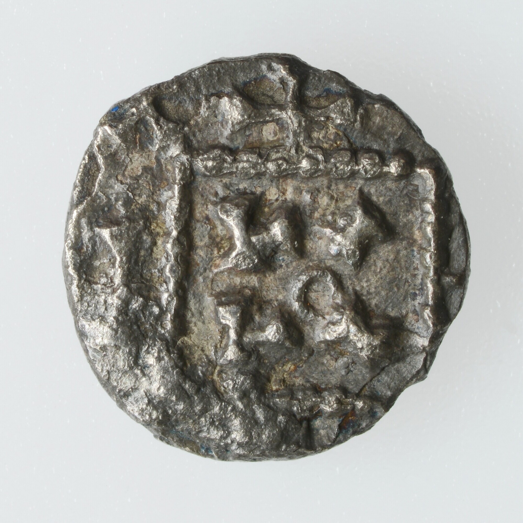 Sceatta BMC type 2b; vz.: kop kijkend naar rechts; kz.: vierkant patroon met vier letters T (?) binnenin; gewicht: 0.67 gram