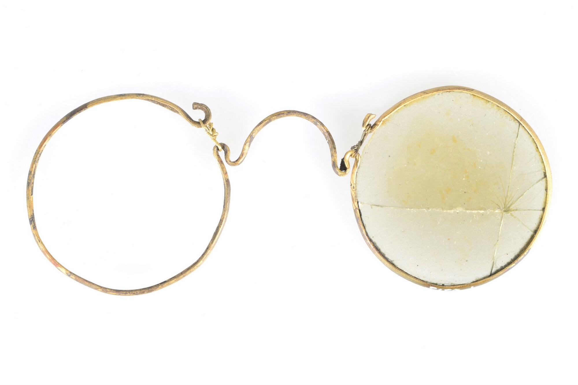 Bril; draadbril/klembril; getrokken/gebogen; montuur is gebogen uit draad en bestaat uit één stuk. De binnenkant van het draad, dat de glazen omrandt, is licht uitgehold. De strip wordt aan weerszijde van de neus met een dun draadje aan de rest van het montuur vastgemaakt; één glas is nog aanwezig en is gebarsten; vak 4, vulling ...
