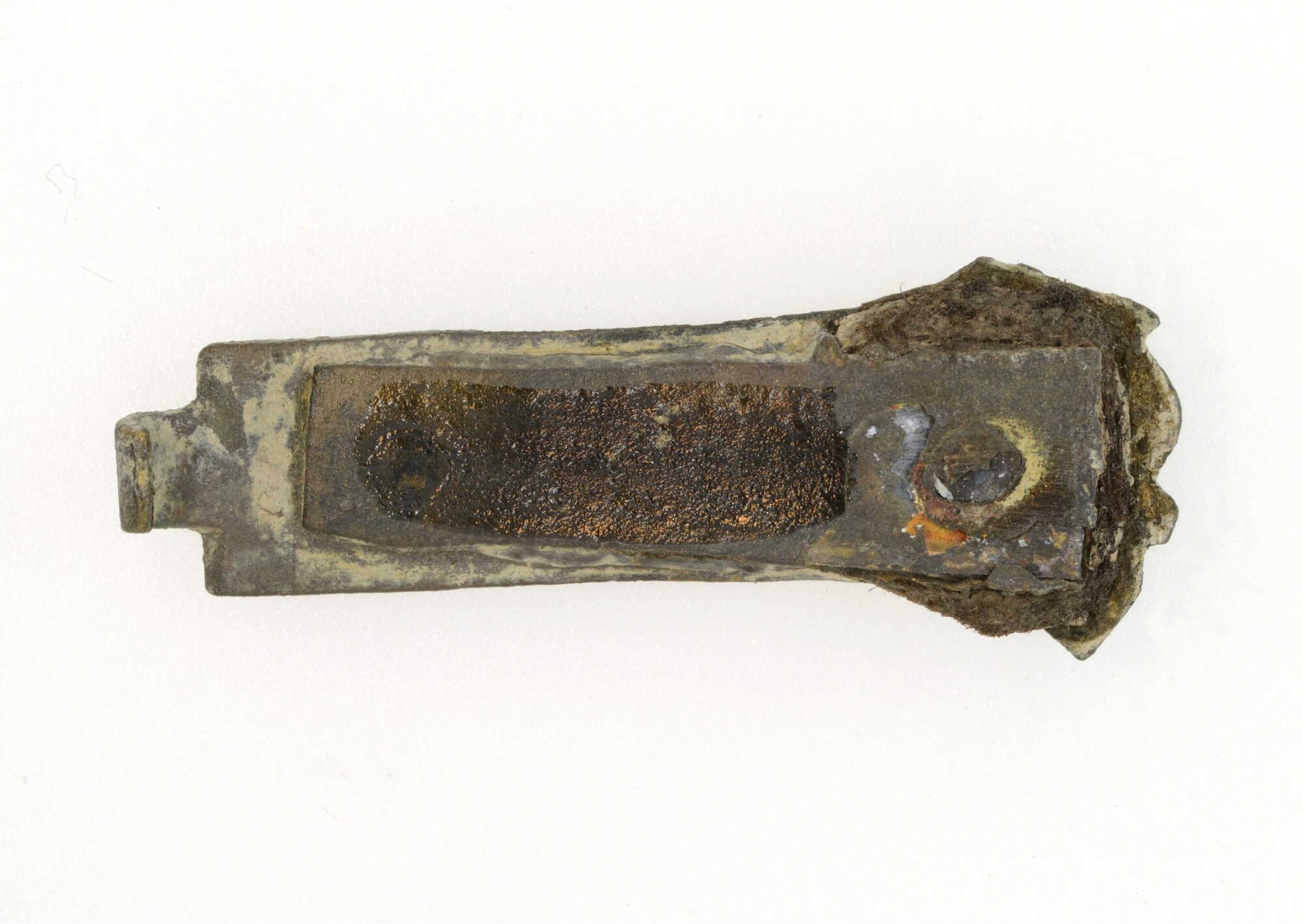 Boekbandsluiting; de sluithaak is voorzien van een klinkplaatje dat aan de achterzijde is vastgeklonken. versierd met een zaagsnede, graveerwerk; restant leer aanwezig