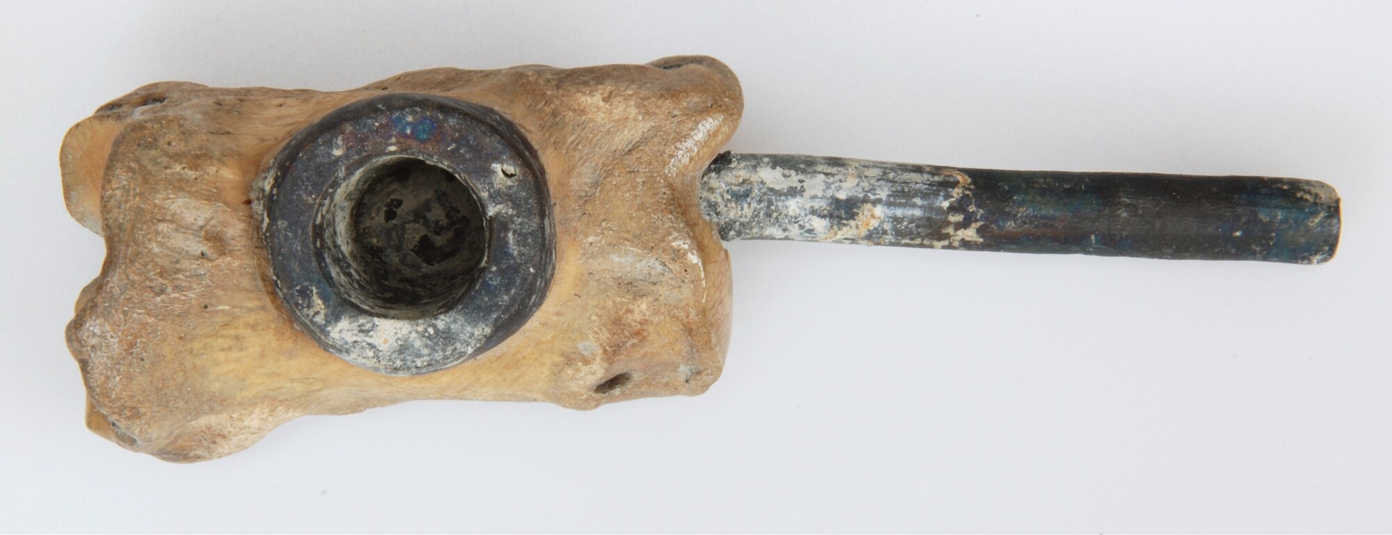Pijp; middenvoetsbeen welke uitgesneden is voor de steel en de ketel van de later te gieten (lood/tinnen) pijp. In been gat geboord voor ophanging van de pijp; op bot snij- en vijlsporen