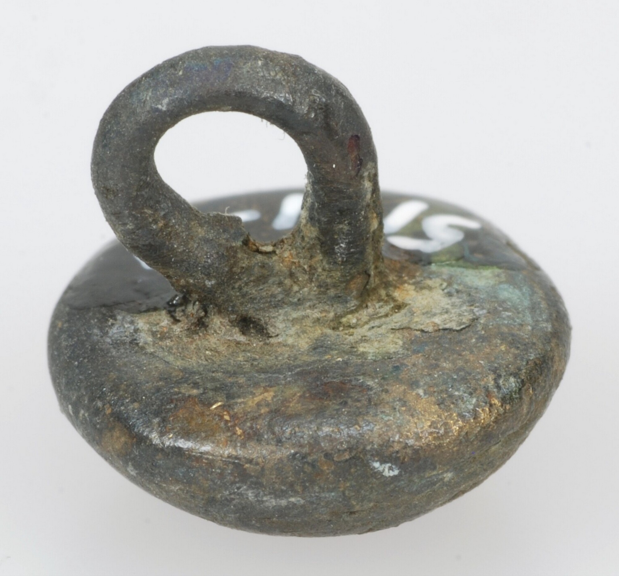 Knoop; halfronde bovenzijde en draadoog; vondstomstandigheden.