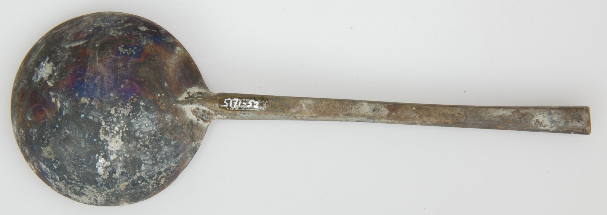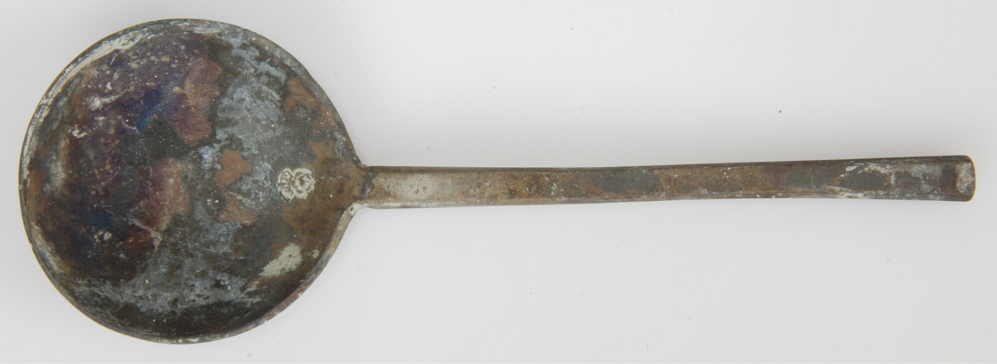 Lepel; sn-lep; ronde bak, hoog zeskantige doorsnede van steel, rechte onversierde steel en top, merkteken in de bak aan de voorzijde onder de brug, verbinding tussen brug en bak, d.m.v. een naaldvormige steun. Merkteken: gekroonde roos met initialen in de kroon: "W.P."