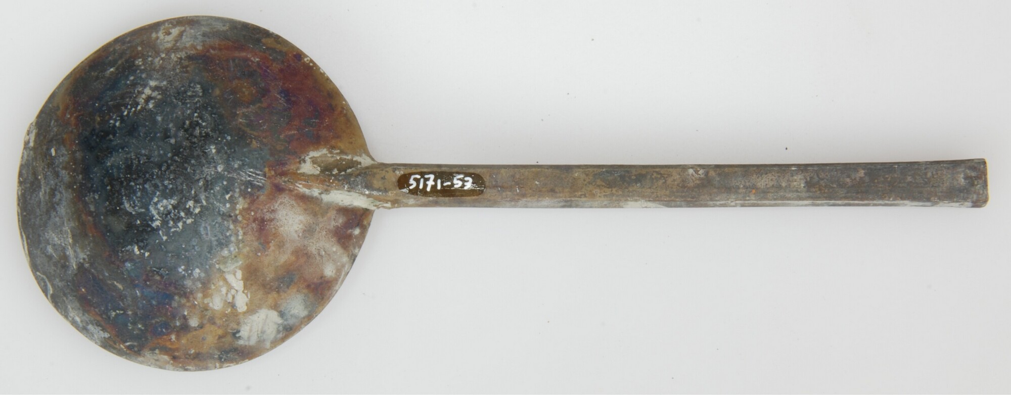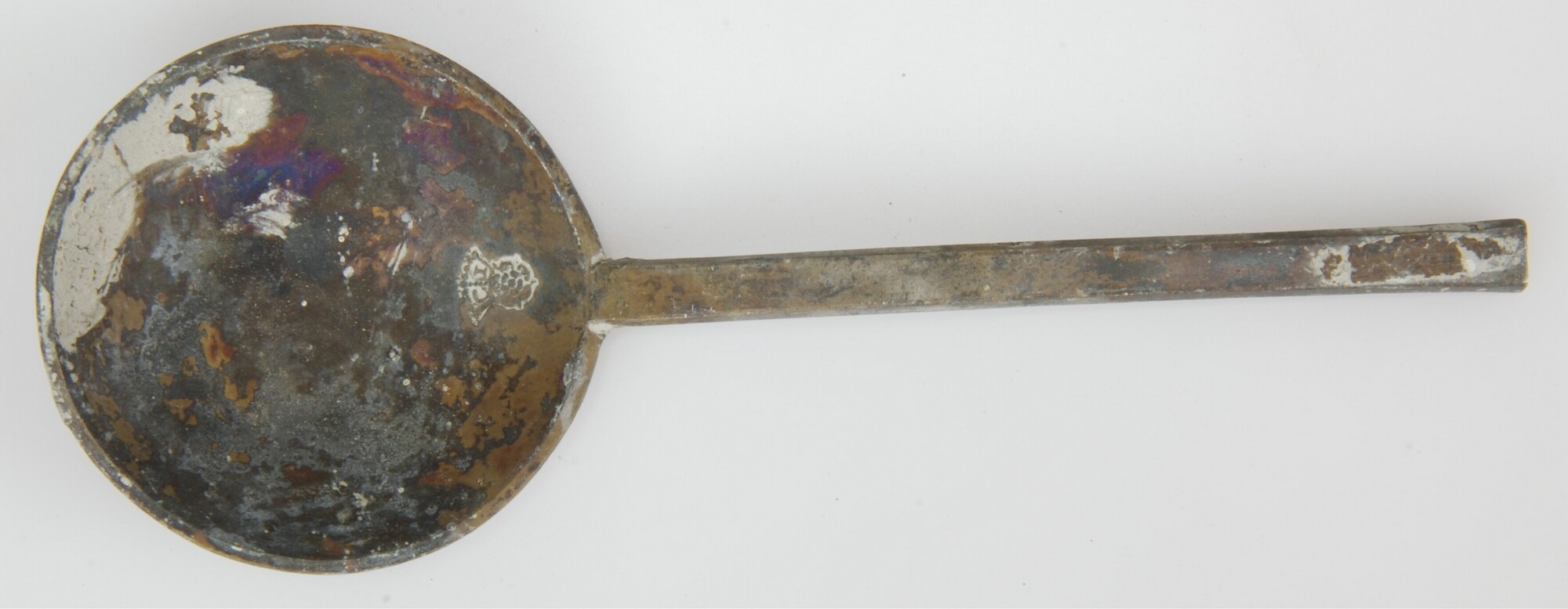 Lepel; sn-lep; Ronde bak, hoog zeskantige doorsnede van steel, trompetvormige top, merkteken in de bak aan de voorzijde onder de brug, verbinding tussen brug en bak, d.m.v. een naaldvormige steun. Merkteken: gekroonde roos met initialen in de kroon: "C.I."