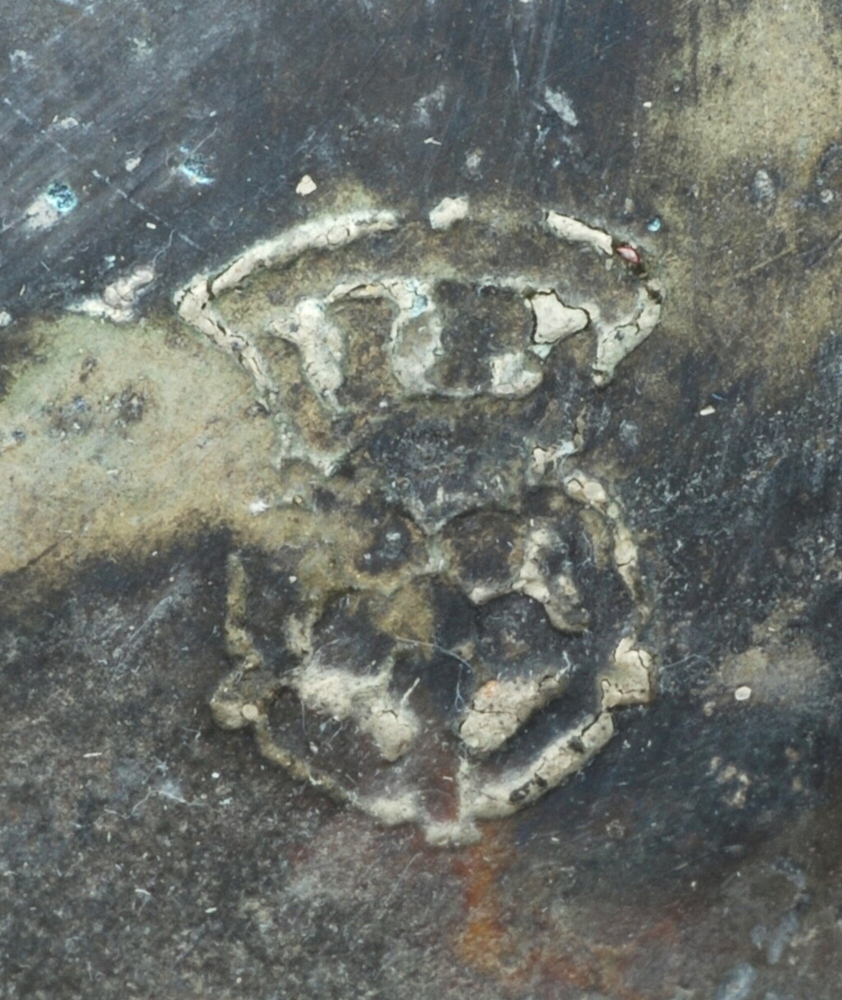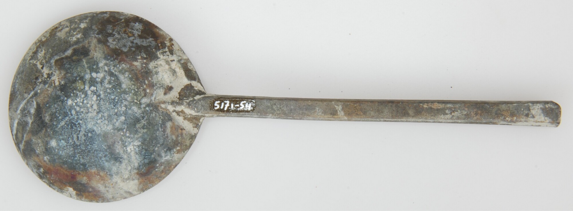 Lepel; sn-lep; ronde bak, hoog zeskantige doorsnede van steel, trompetvormige top, merkteken in de bak aan de voorzijde onder de brug, verbinding tussen brug en bak, d.m.v. een naaldvormige steun. Merkteken: gekroonde roos met initialen in de kroon: "I.P."