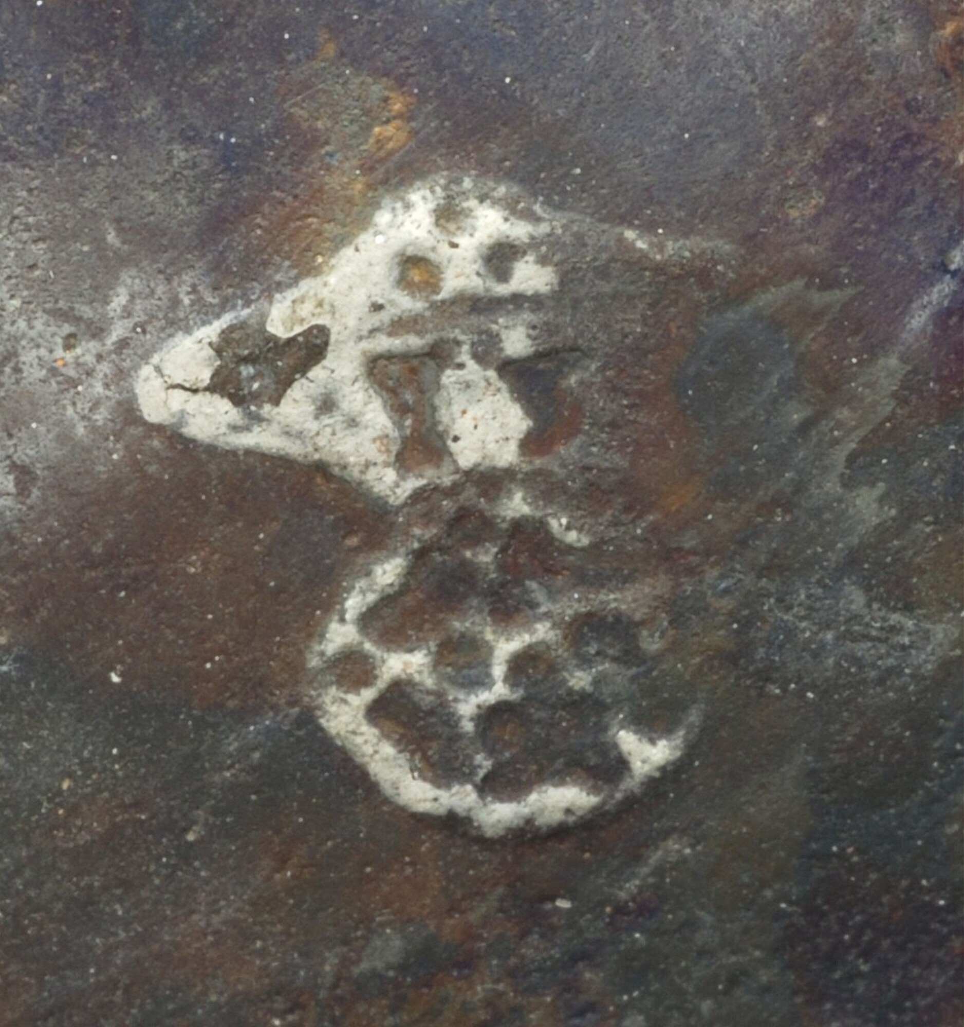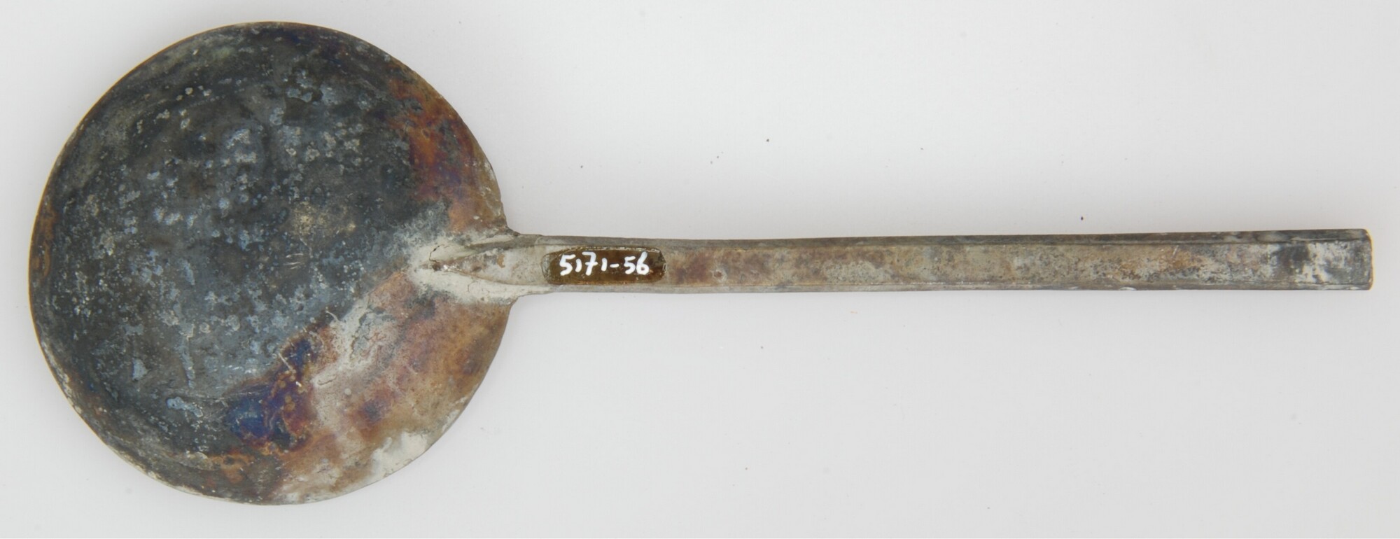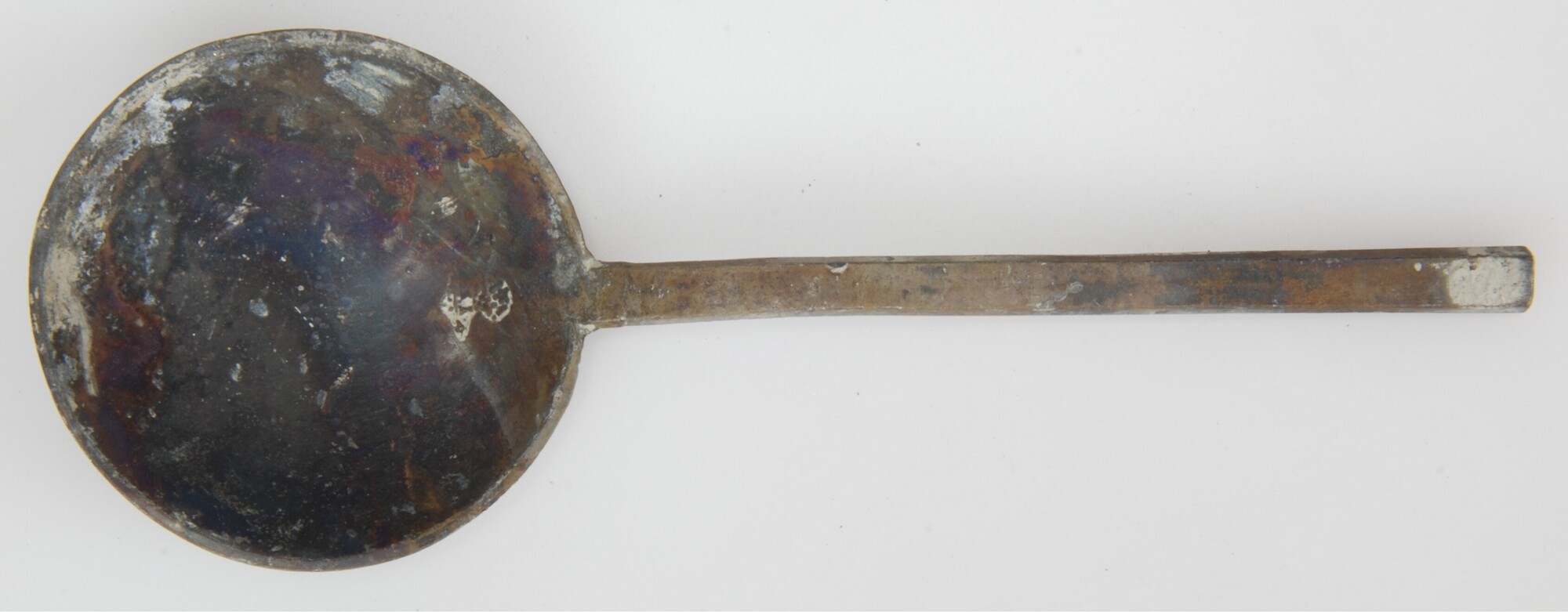 Lepel; sn-lep; ronde bak, hoog zeskantige doorsnede van steel, trompetvormige top, merkteken in de bak aan de voorzijde onder de brug, verbinding tussen brug en bak, d.m.v. een naaldvormige steun. Merkteken: gekroonde roos met initialen in de kroon: "I.I''.