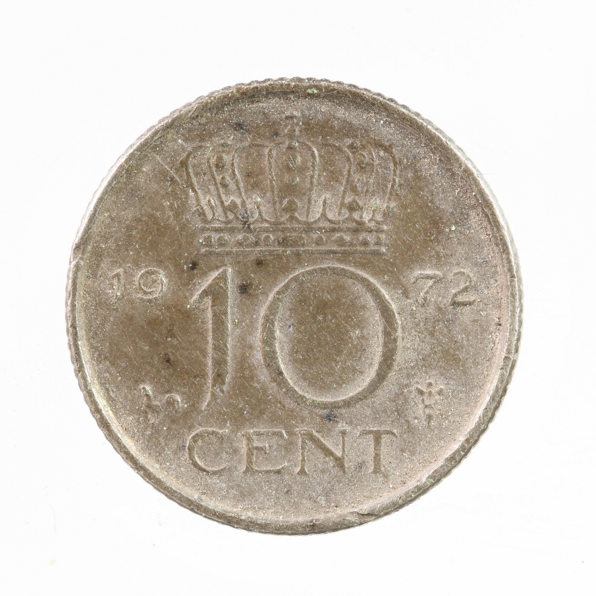 10 Cent; vz: 10 cent en jaartal 1972 onder kroon; kz: portret van Juliana naar rechts, omschrift: Juliana Koningin der Nederlanden; gewicht: 1,5 gram
