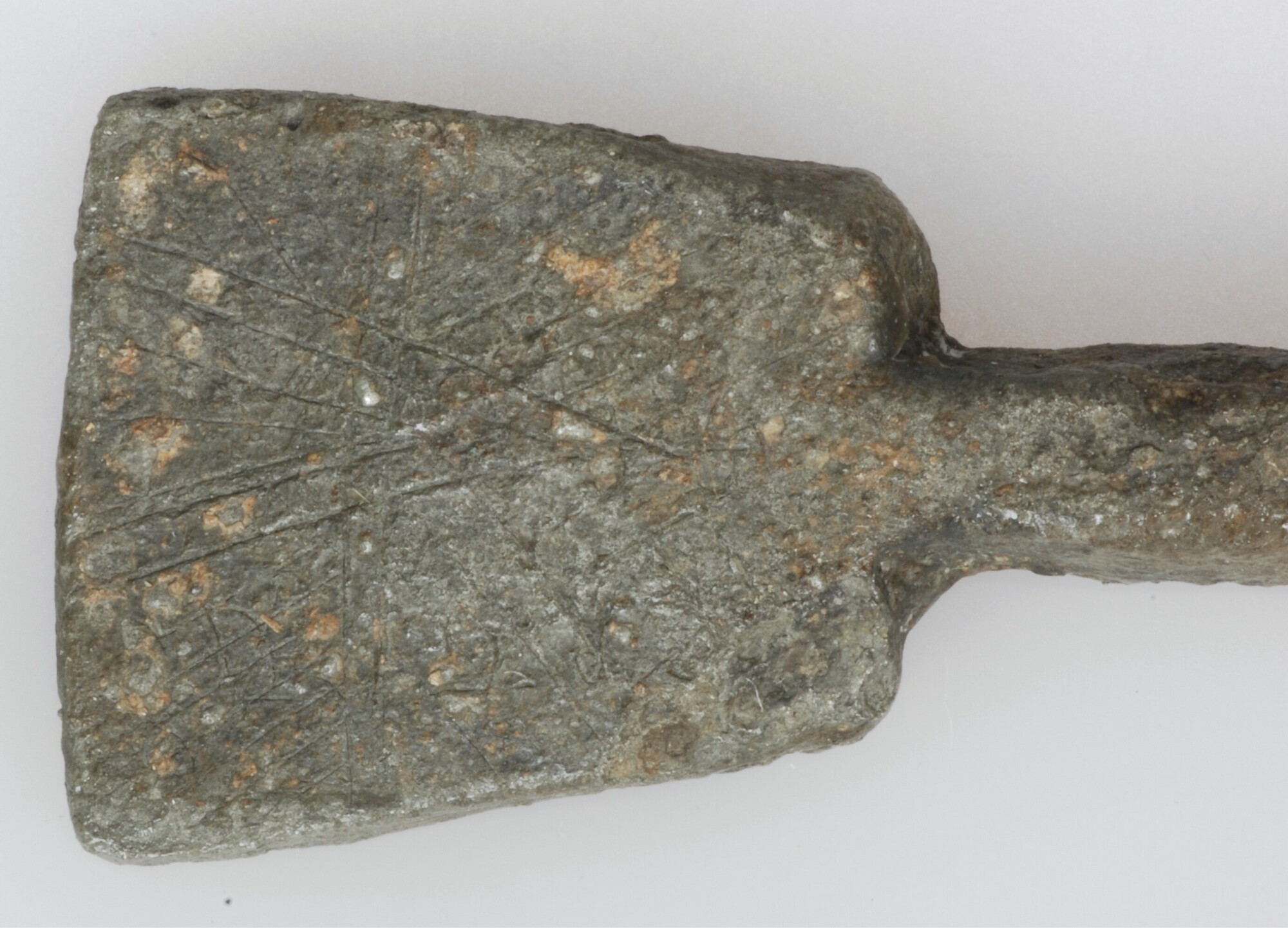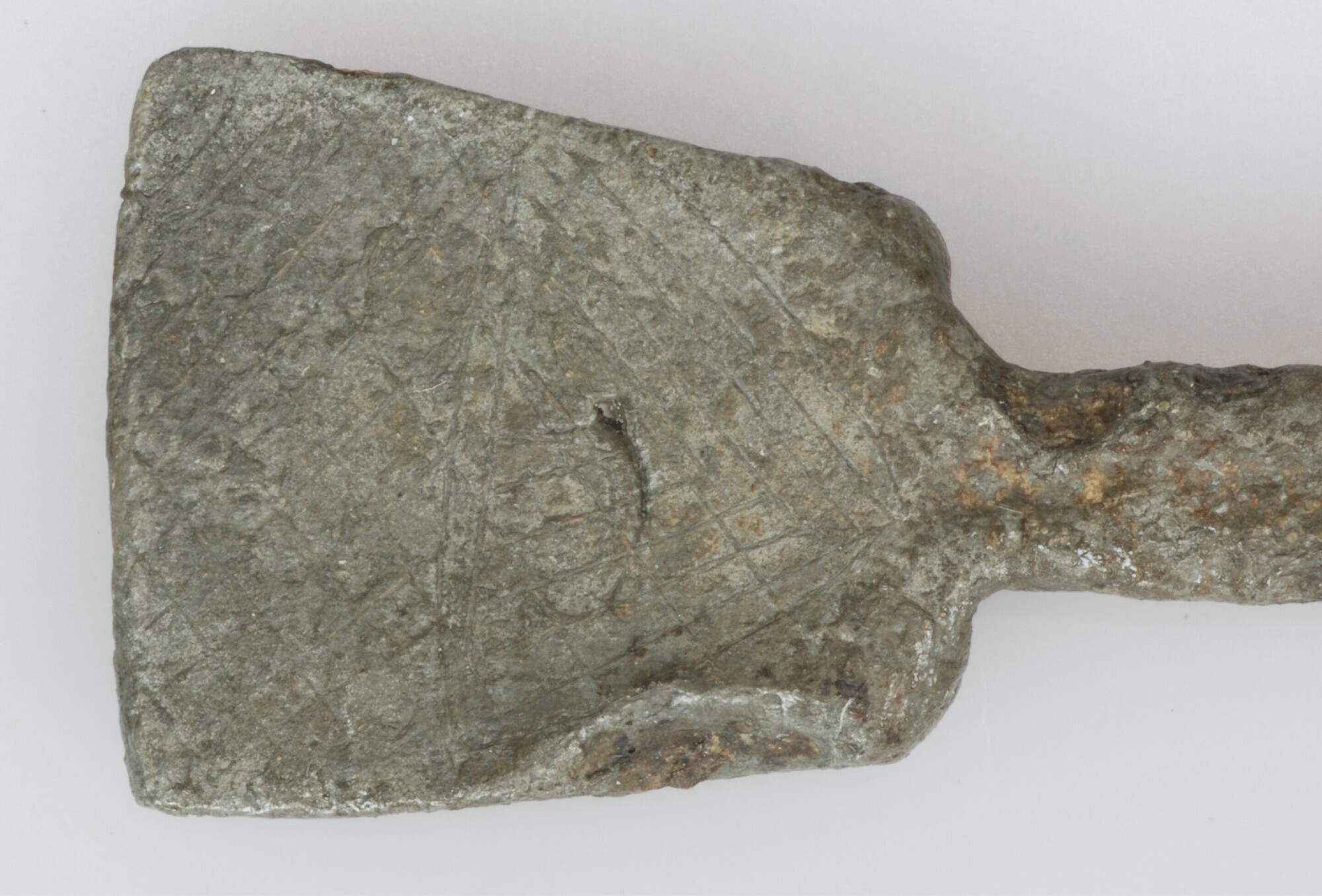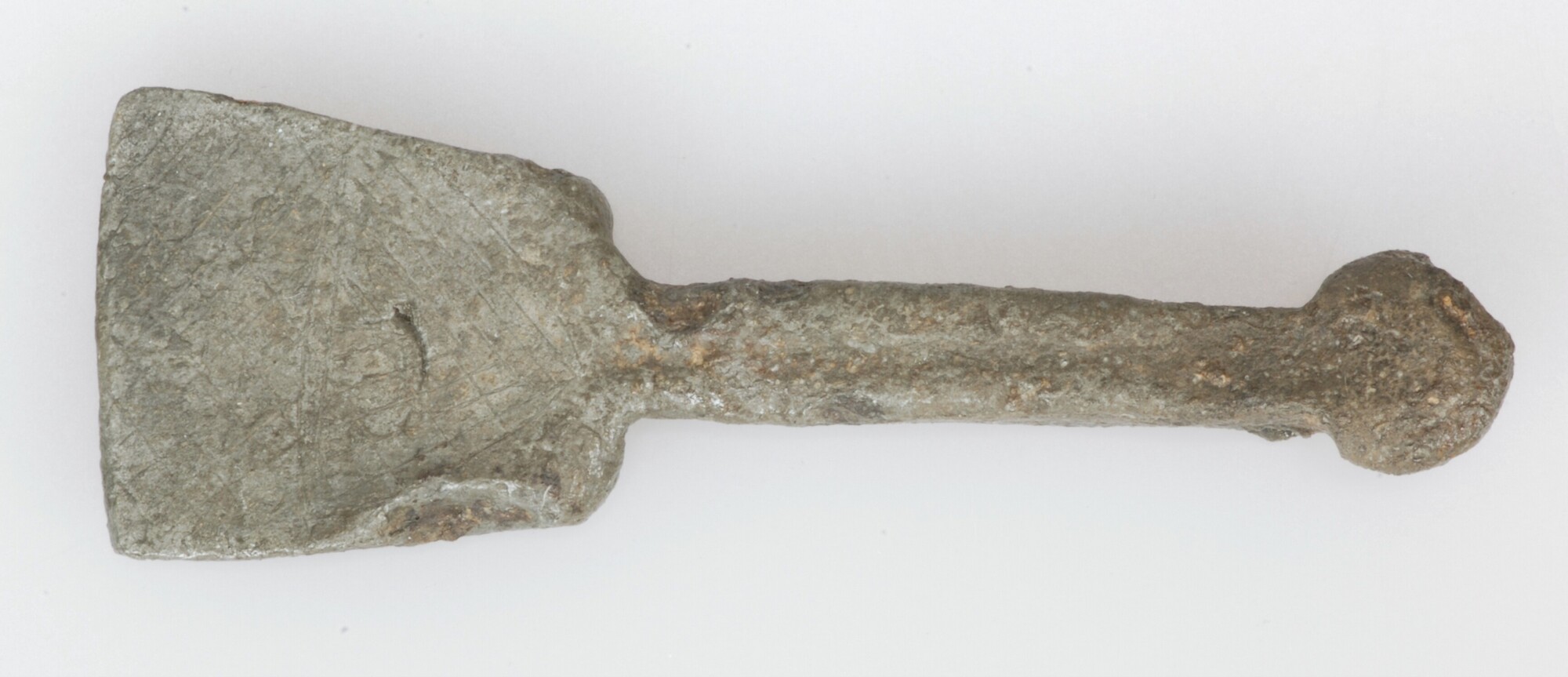 Spatel; miniatuur-schepje; achterzijde is afgeplat en de steel is aan het uiteinde doorboord; op het platte deel zijn verscheidene krassen in geometrisch patroon aangebracht; vondstomstandigheden: spoor 61 (Fase 1: 12e-13e eeuw)