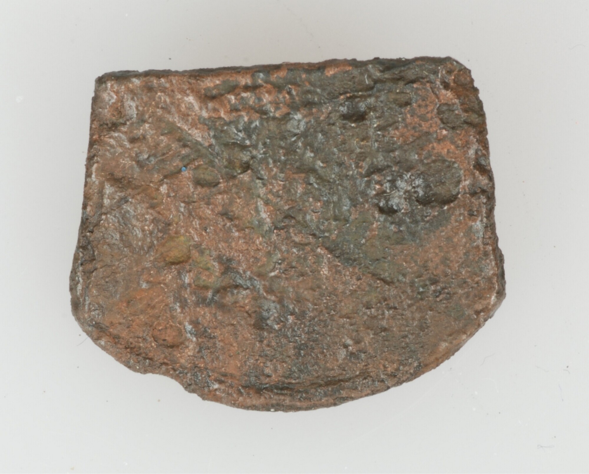 Mesheftbekroning; halfrond vierkant plaatje met bevestigingsnagel; vondstomstandigheden: afwerken onder stenen vloertje spoor 48