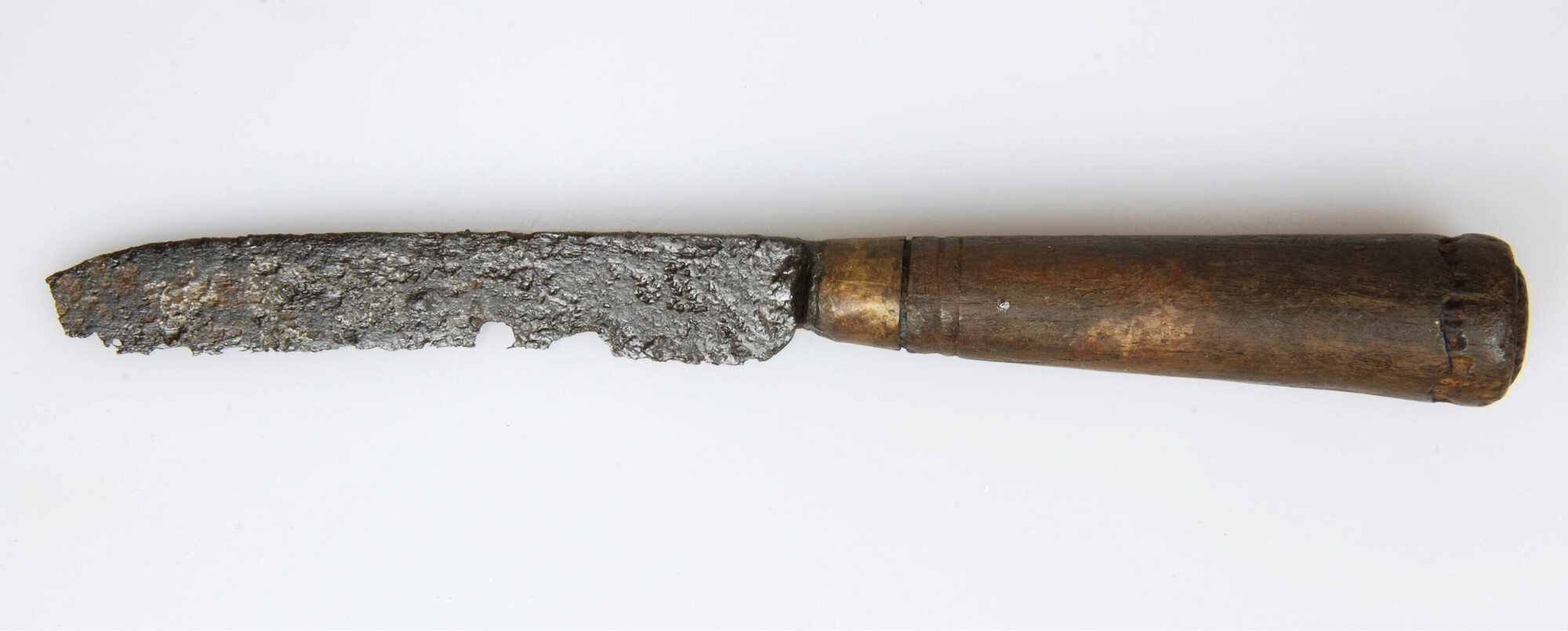 Mes; ijzeren lemmet, een versierd houten opschuifheft en een messing heftbeschermer; drie merktekens op het lemmet