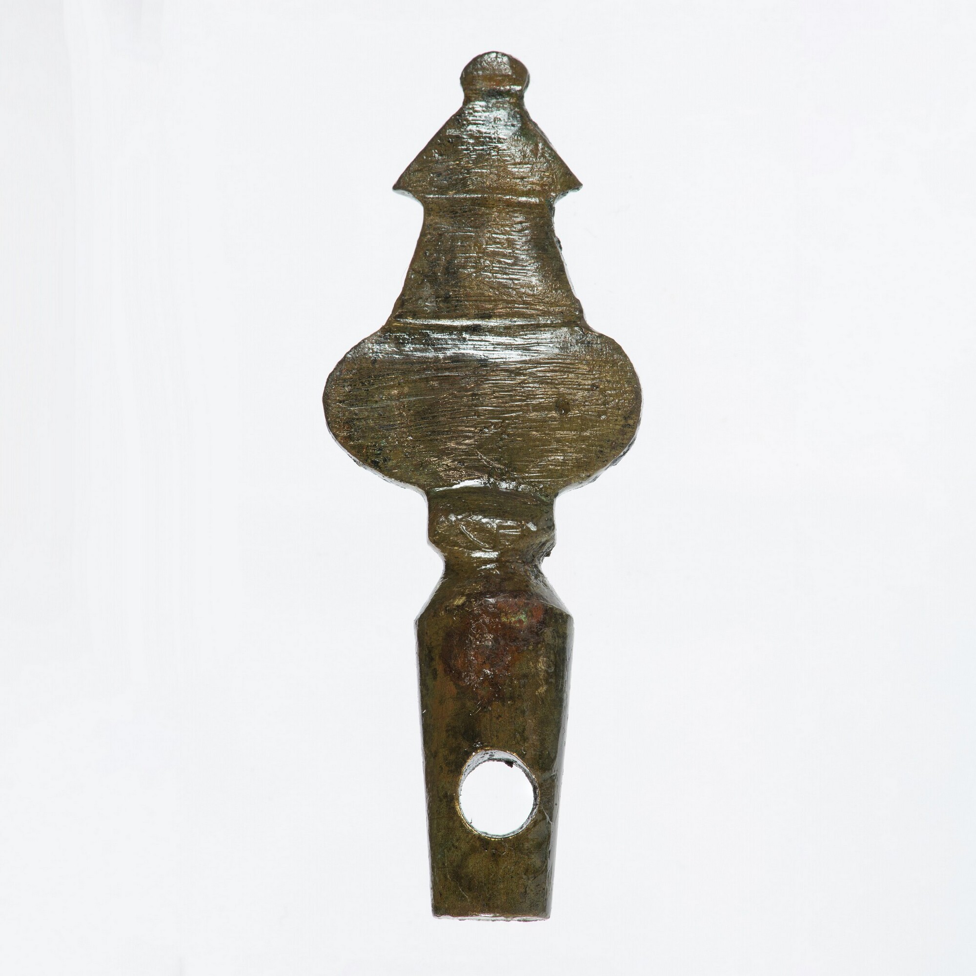 Kraan; onderdeel tapkraan; massieve buis met centraal gat en versierde handgreep