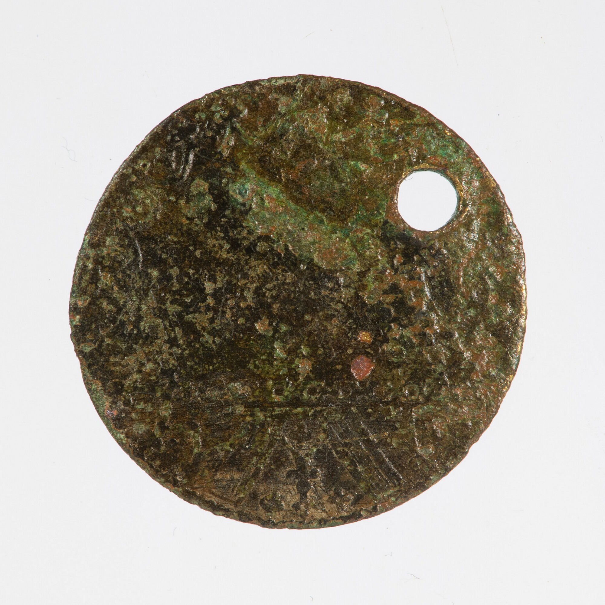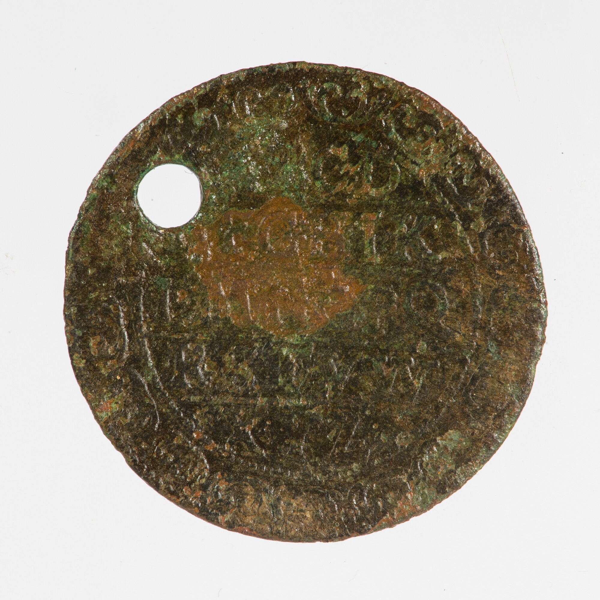 Rekenpenning; vz.: alfabet; kz.: man achter rekentafel; secundaire doorboring; muntplaats: Neurenberg; gewicht: 3.02 gram