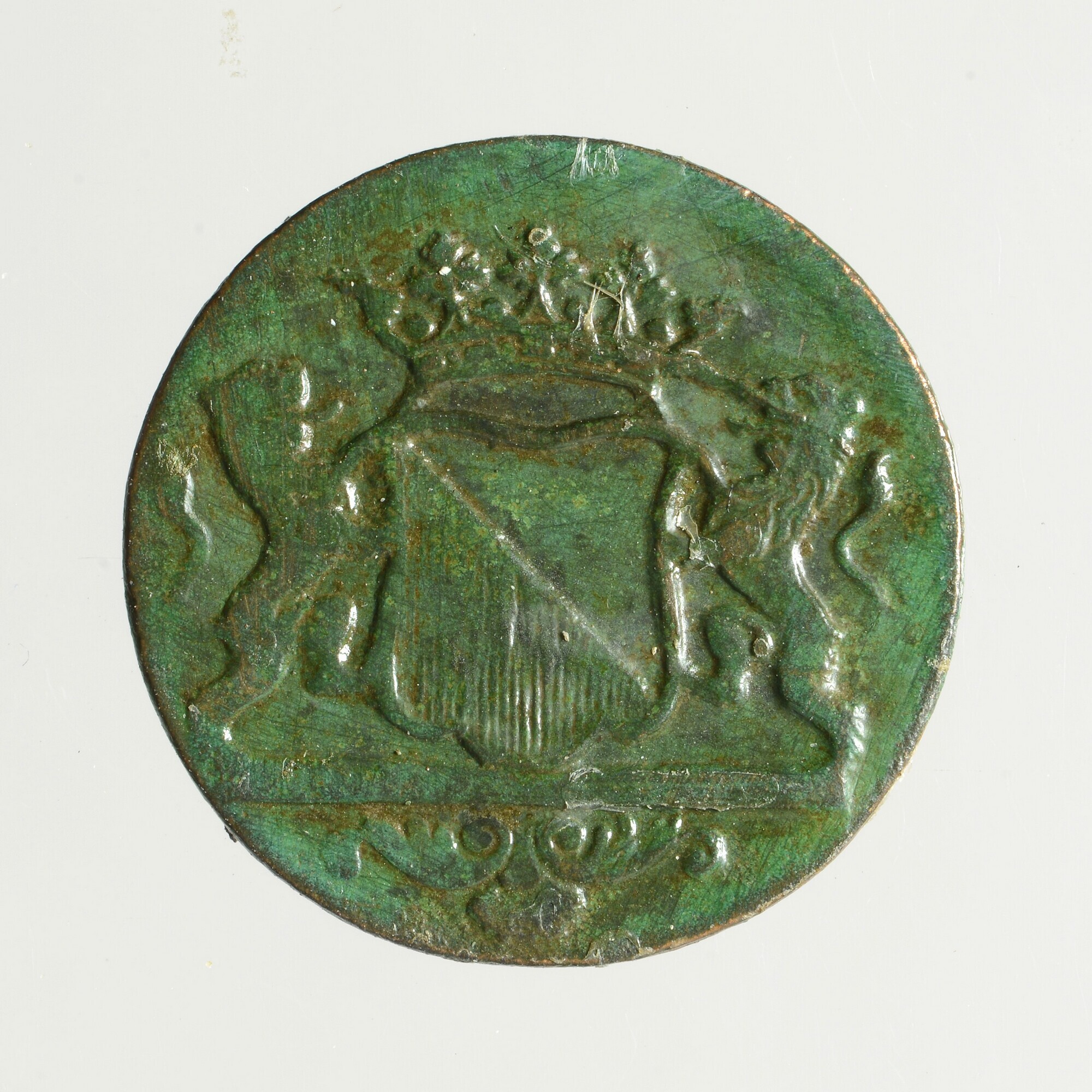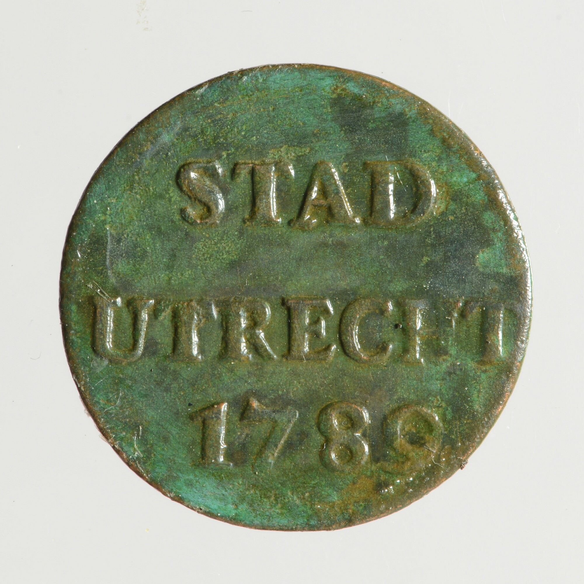 Duit; Utrecht stad (1581-1795); vz.: in drie regels: STAD / UTRECHT / 1789; kz.: stedelijk wapenschild, gehouden door twee leeuwen, aan de onderzijde een versierde accolade met een grote schelp; muntplaats: Utrecht; gewicht: 2.98 gram