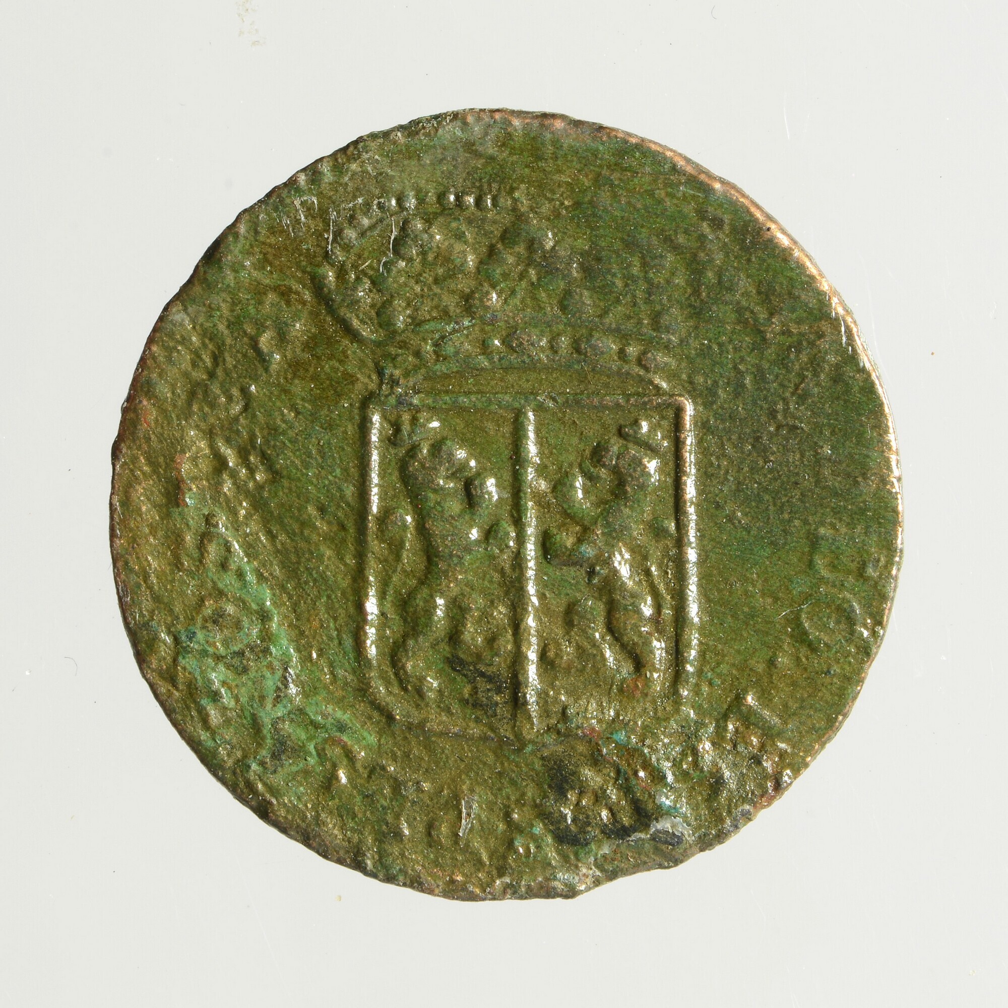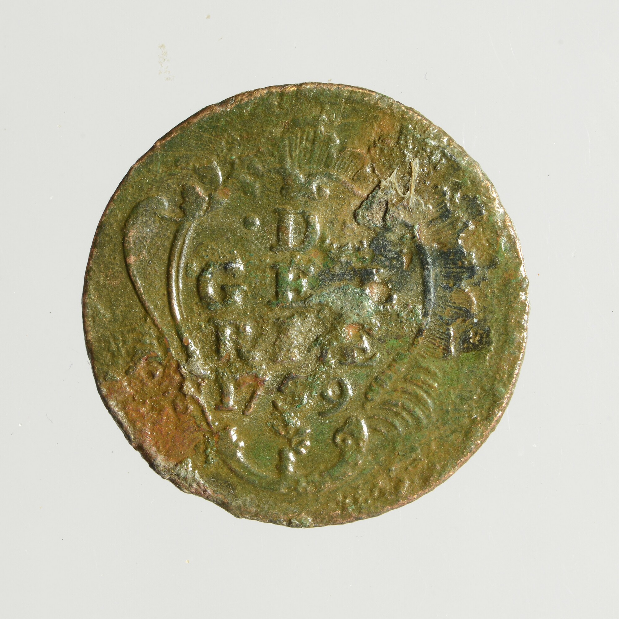 Duit; Gelderland provincie (1581-1795); vz.: rococostijl versiering met daarbinnen in vijf regels: • D • / GEL / RIAE / 1759 / (geknotte boom met loot); kz.: gekroond wapenschild van Gelderland, omschrift IN DEO EST SPES NOSTRA; muntplaats: Harderwijk; gewicht: 2.82 gram
