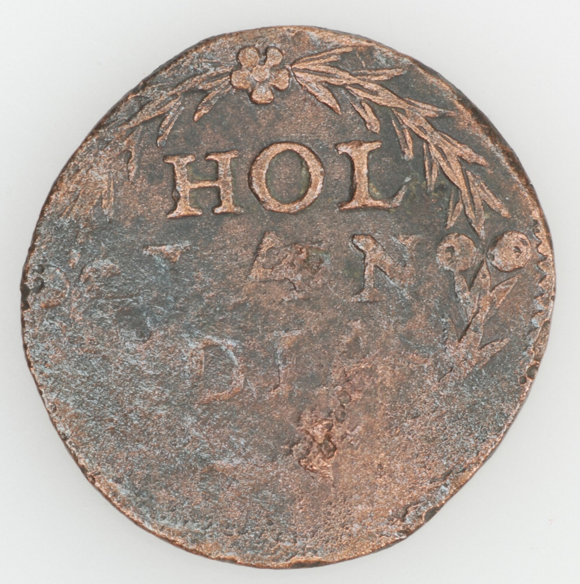 Duit; Holland Provincie (1581-1795); vz.: binnen een bladerkans in drie regels: HOL / LAN / DIA; kz.: de Hollandse maagd zittende in een gesloten tuin. Zij wijst met haar rechterhand naar een zonnige hemel als teken van het vertrouwen op de Heer.omschrift [•AV]X•N[OS•IN•]NOM•]DO[M•(rozet)]; gewicht: 3.30 gram