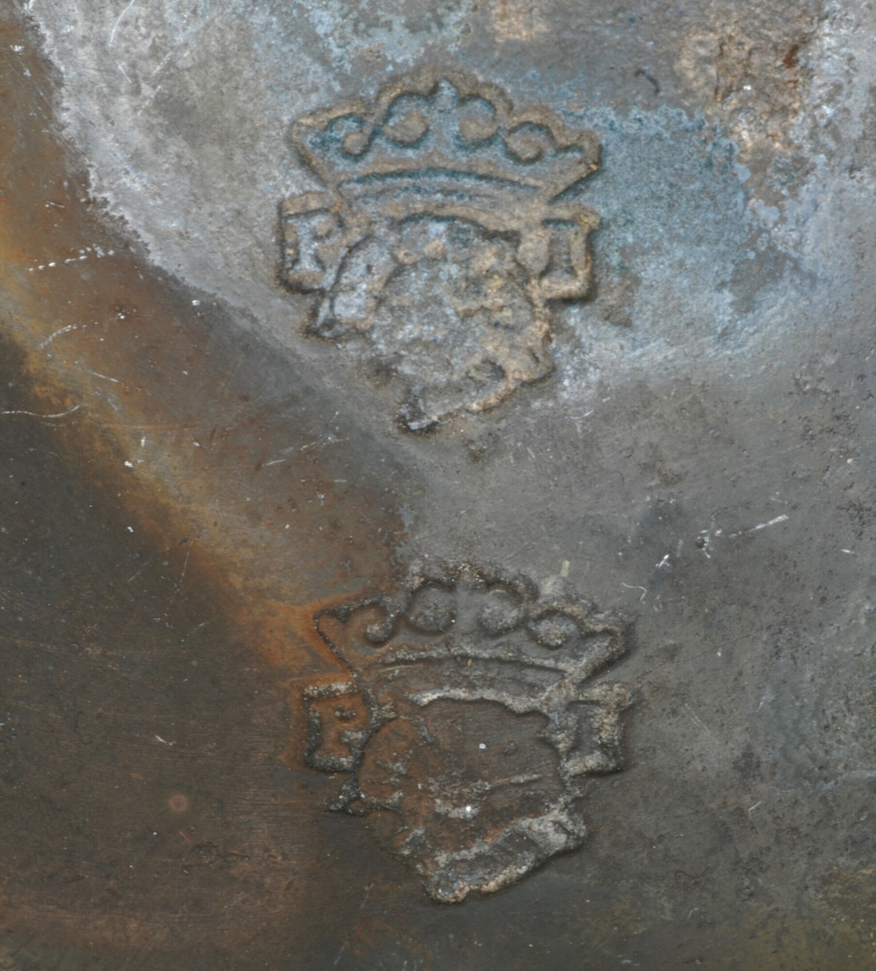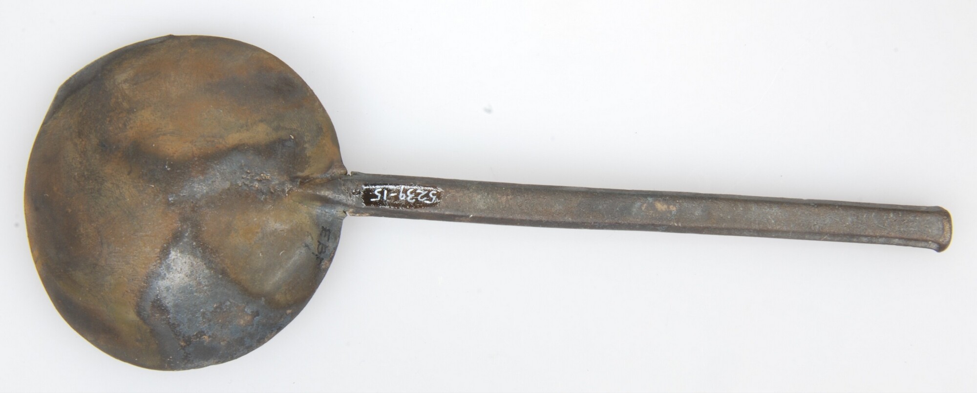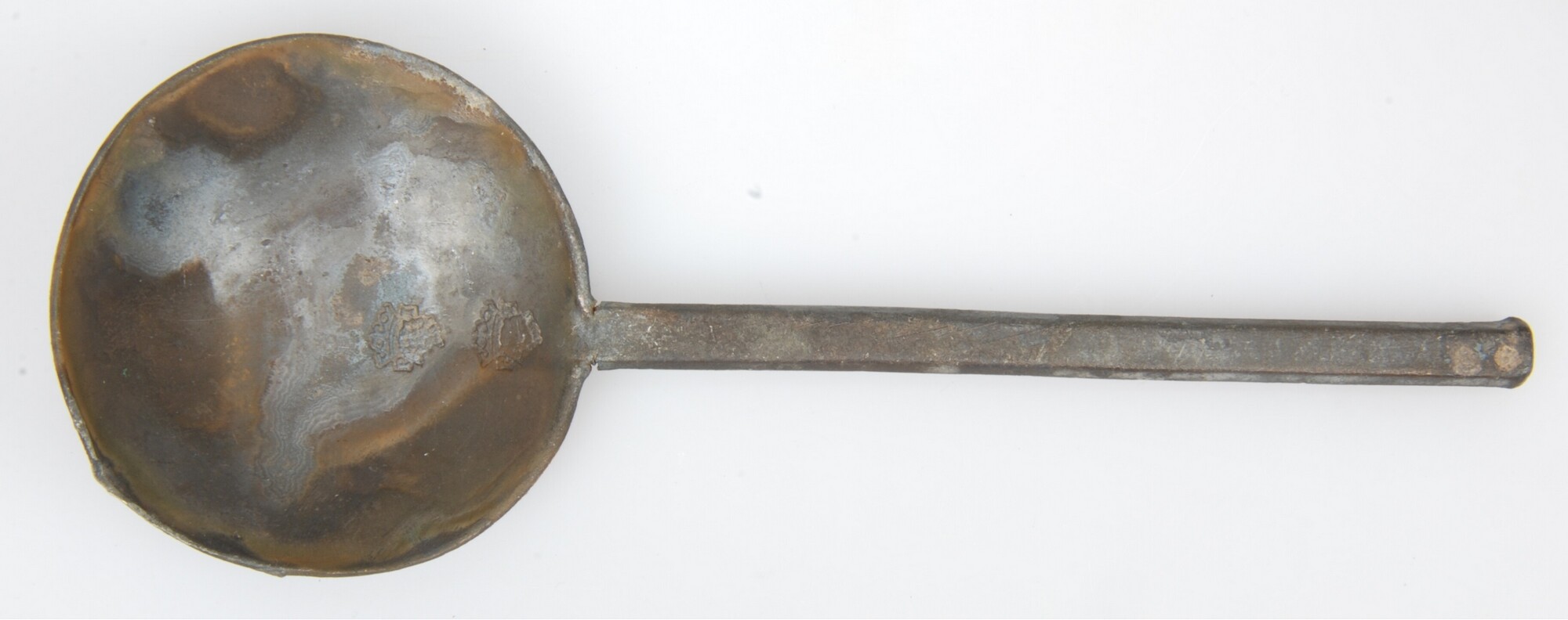 Lepel; ronde, diepe bak met twee merktekens