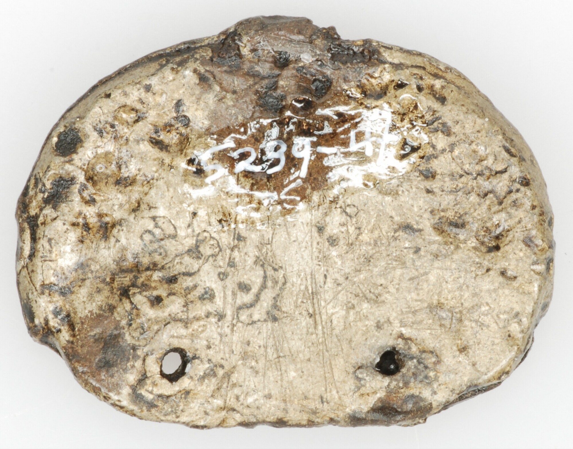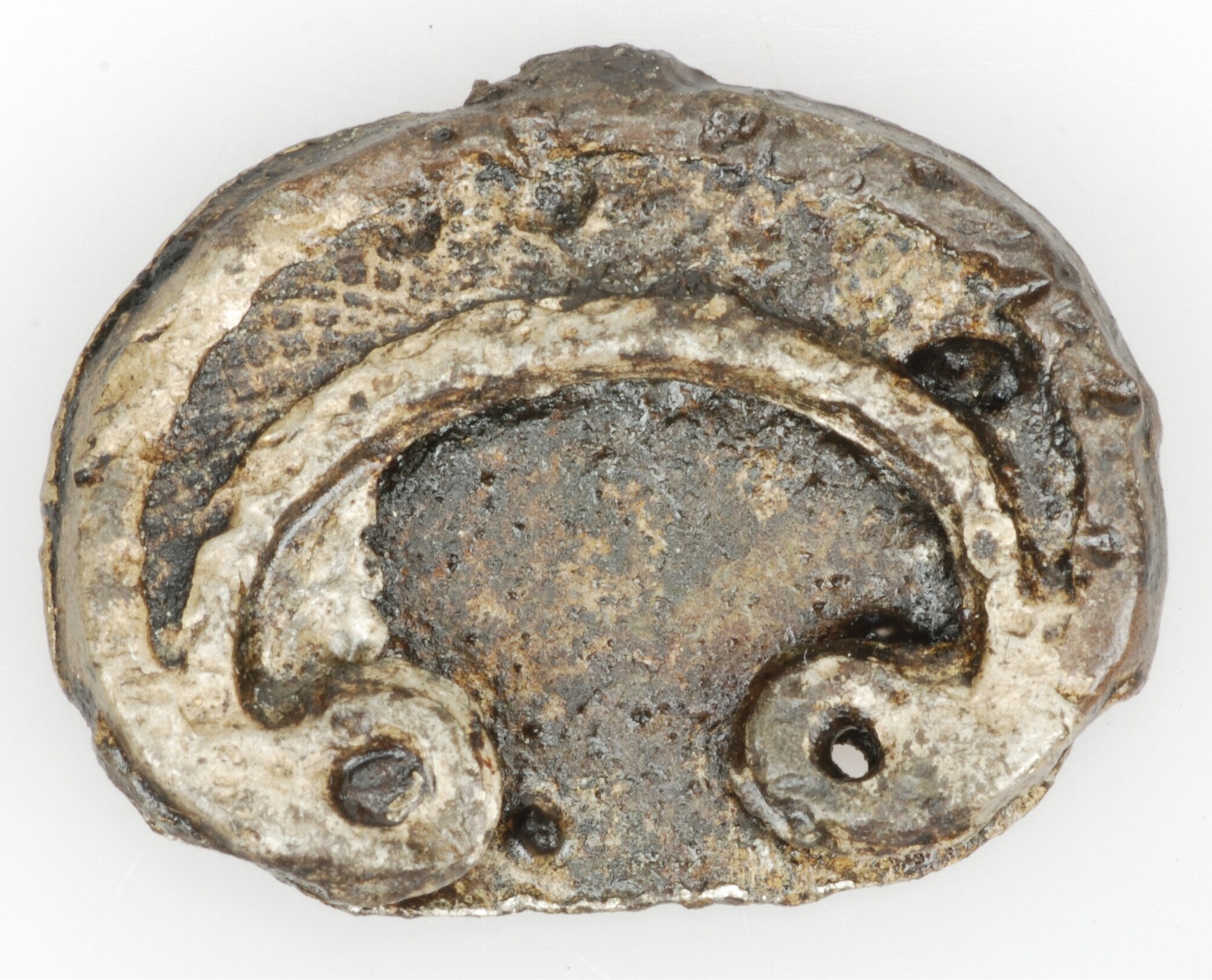 Riemtong; halfrond plaatje met maanvormige versiering en twee bevestigingsgaatjes