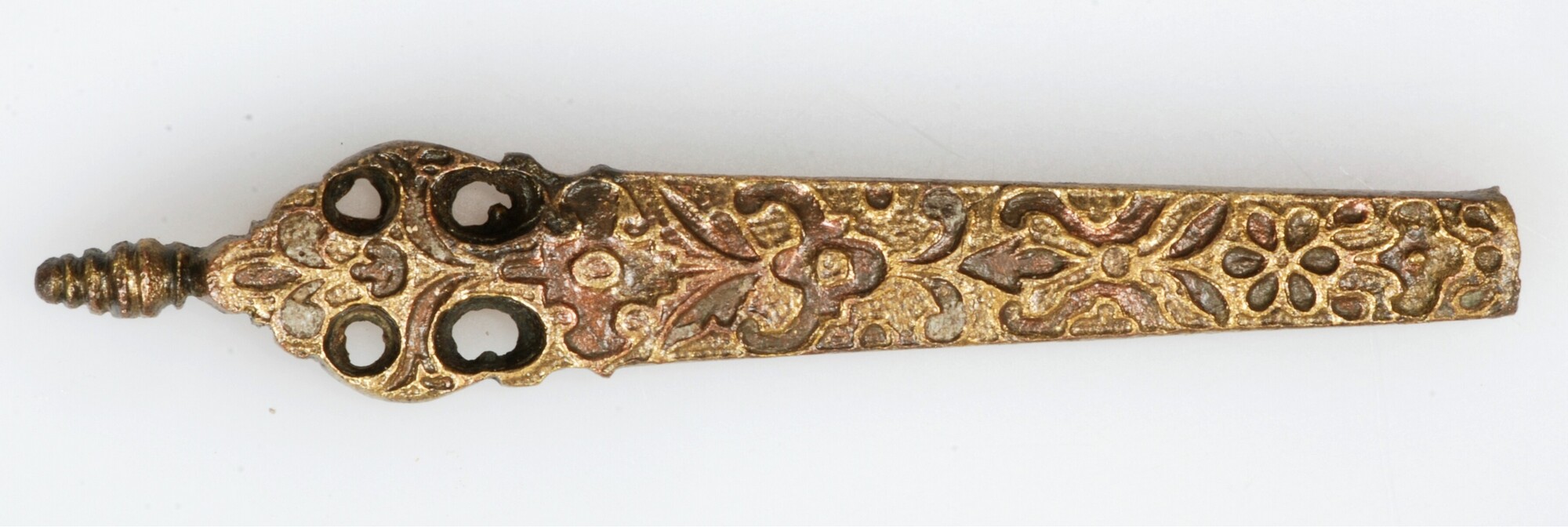Mesheft; opschuifheft; versierd met bloemen- en rankenmotieven. De verdiepte gedeeltes zijn oorspronkelijk met email ingelegd geweest. Van het email resteren nog maar enkele fragmenten