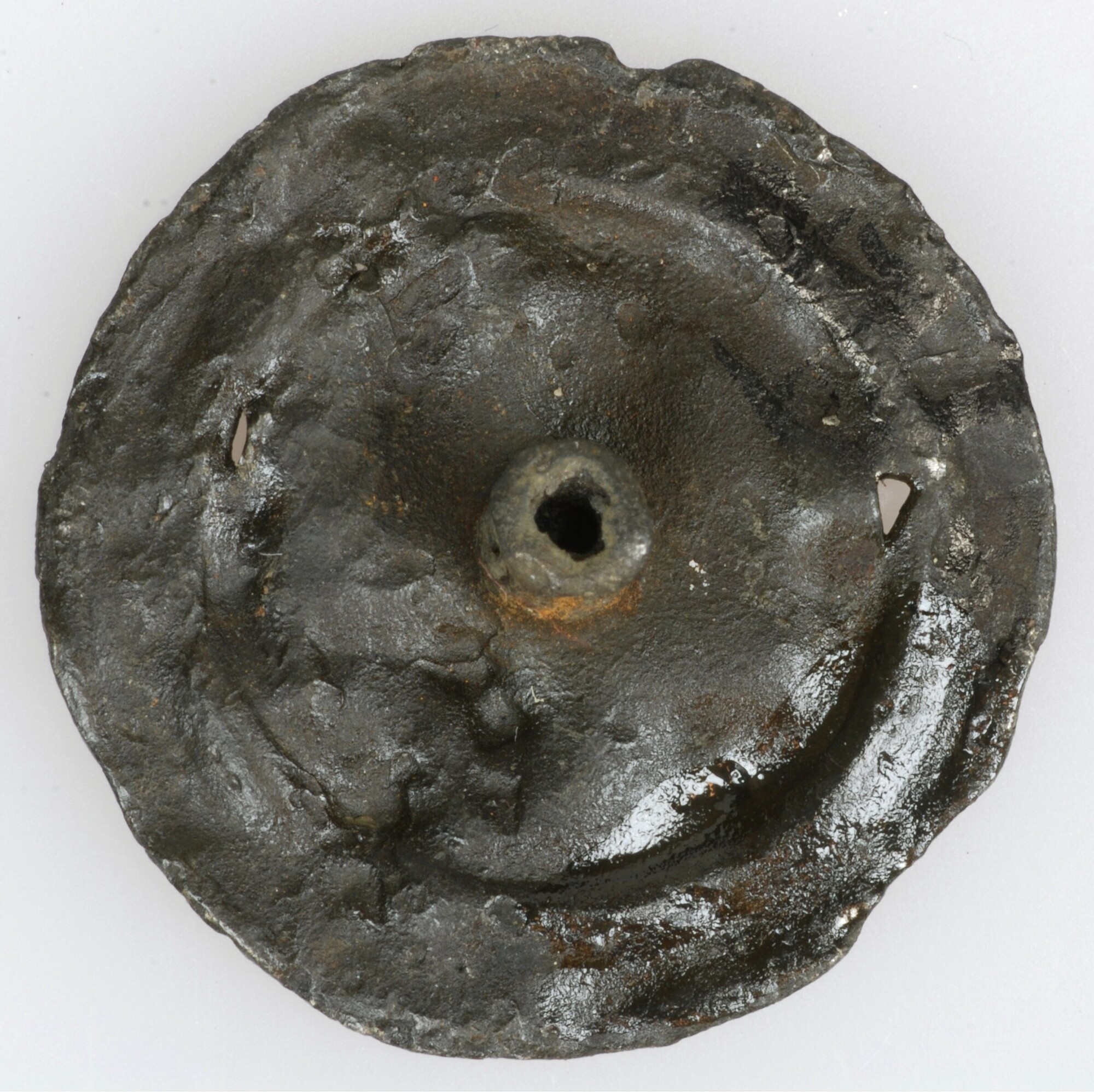 Deksel; speelgoed?; rond met aan de voorzijde een bloemdecoratie; achterzijde voorzien van een rond gat
