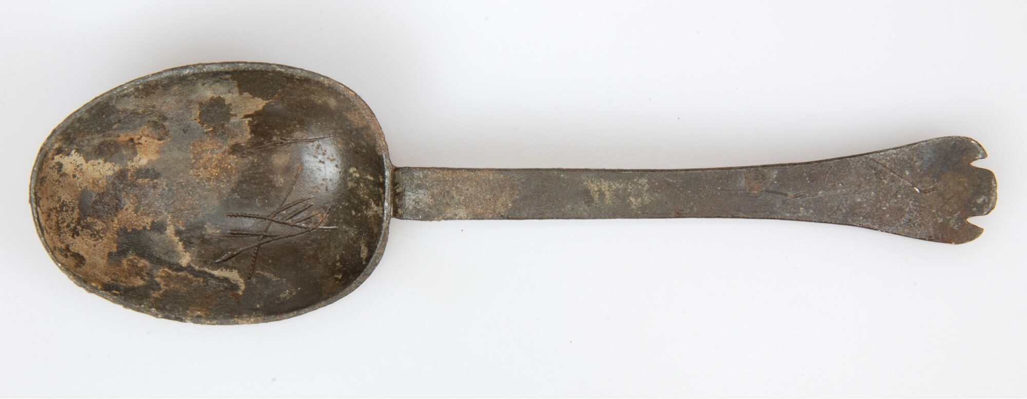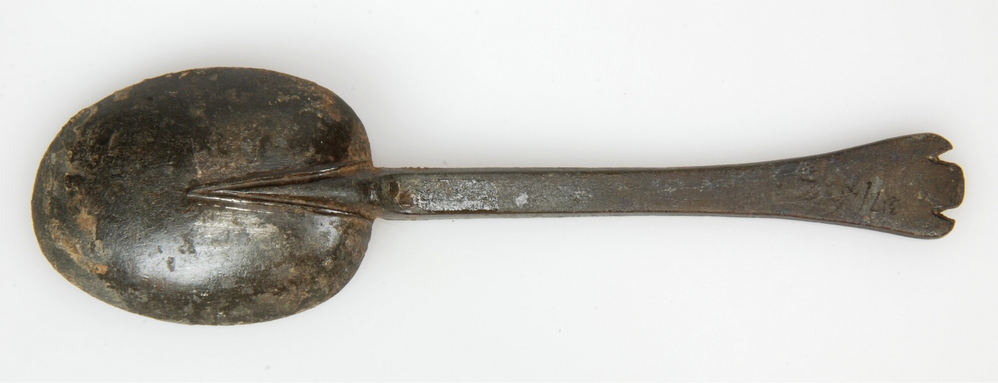 Lepel; sn-lep; ovale bak en platte steel met pied de biche (breekijzer-vorm) en zeer lange naald aan de achterzijde van de bak; op de bak zijn enkele diepe krassen aangebracht
