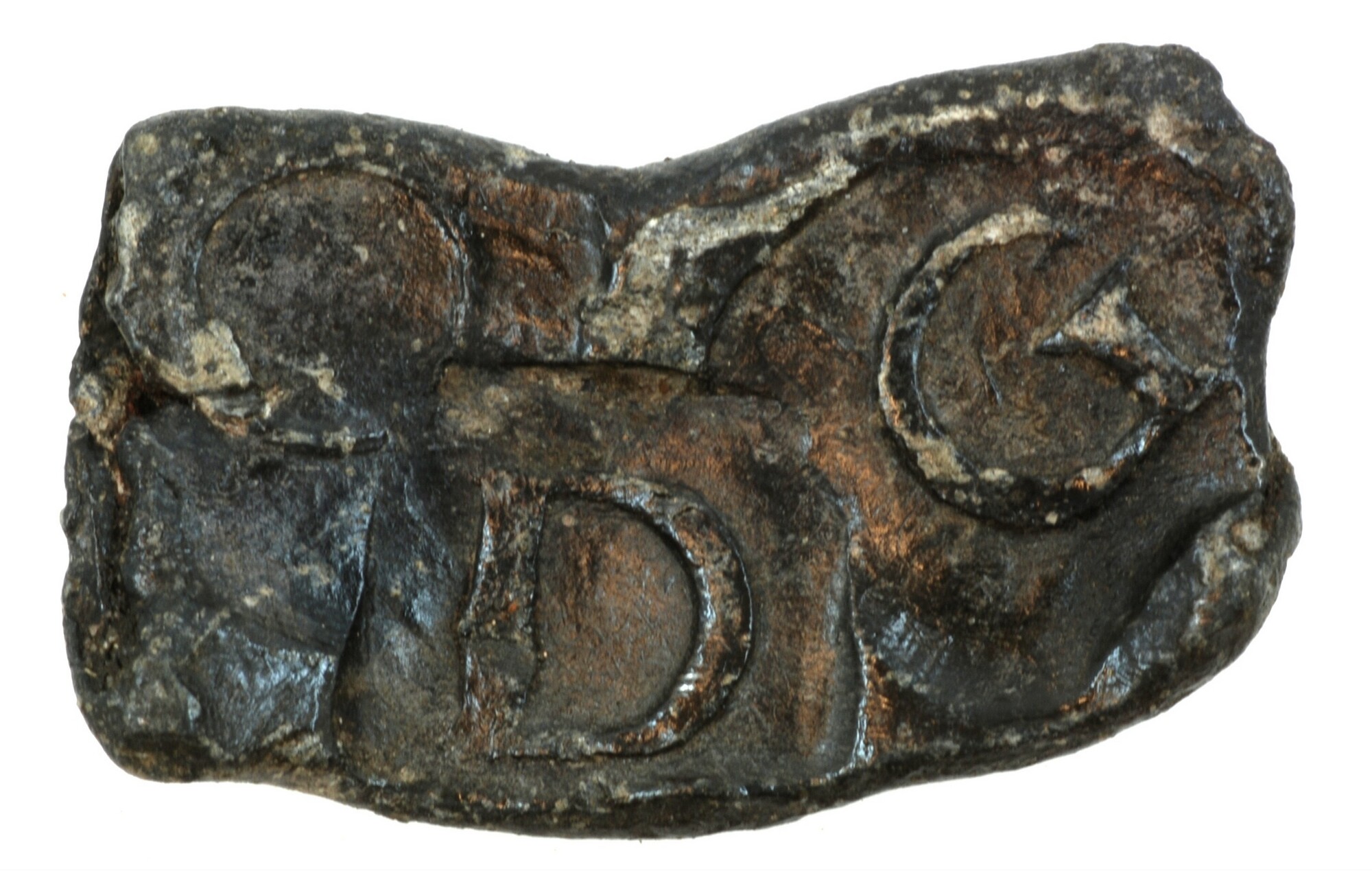 Pijplood; pb-tex; rechthoekig lood voorzien van een drietal letterstempels