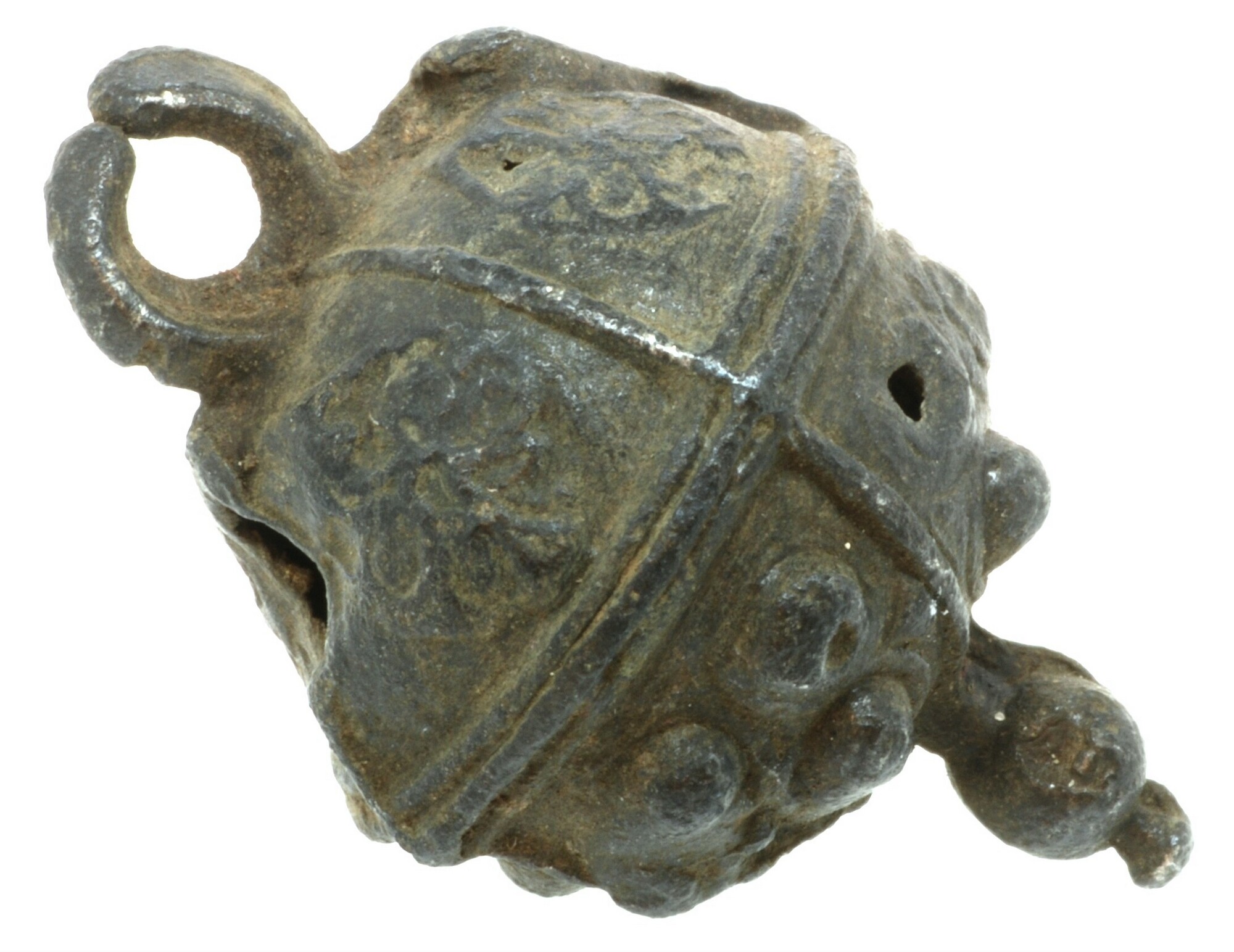 Pomander (ruikvat?); klein hol, bolvormig object met een ophangoogje en een puntje aan de onderzijde. De bovenste helft is verdeeld in kwadranten met ronde radvormige versieringen. De onderste helft is eveneens verdeeld in kwadranten en versierd met noppen; voorzien van twee gaatjes aan de bovenzijde en twee kleinere gaatjes aan de onderzijde