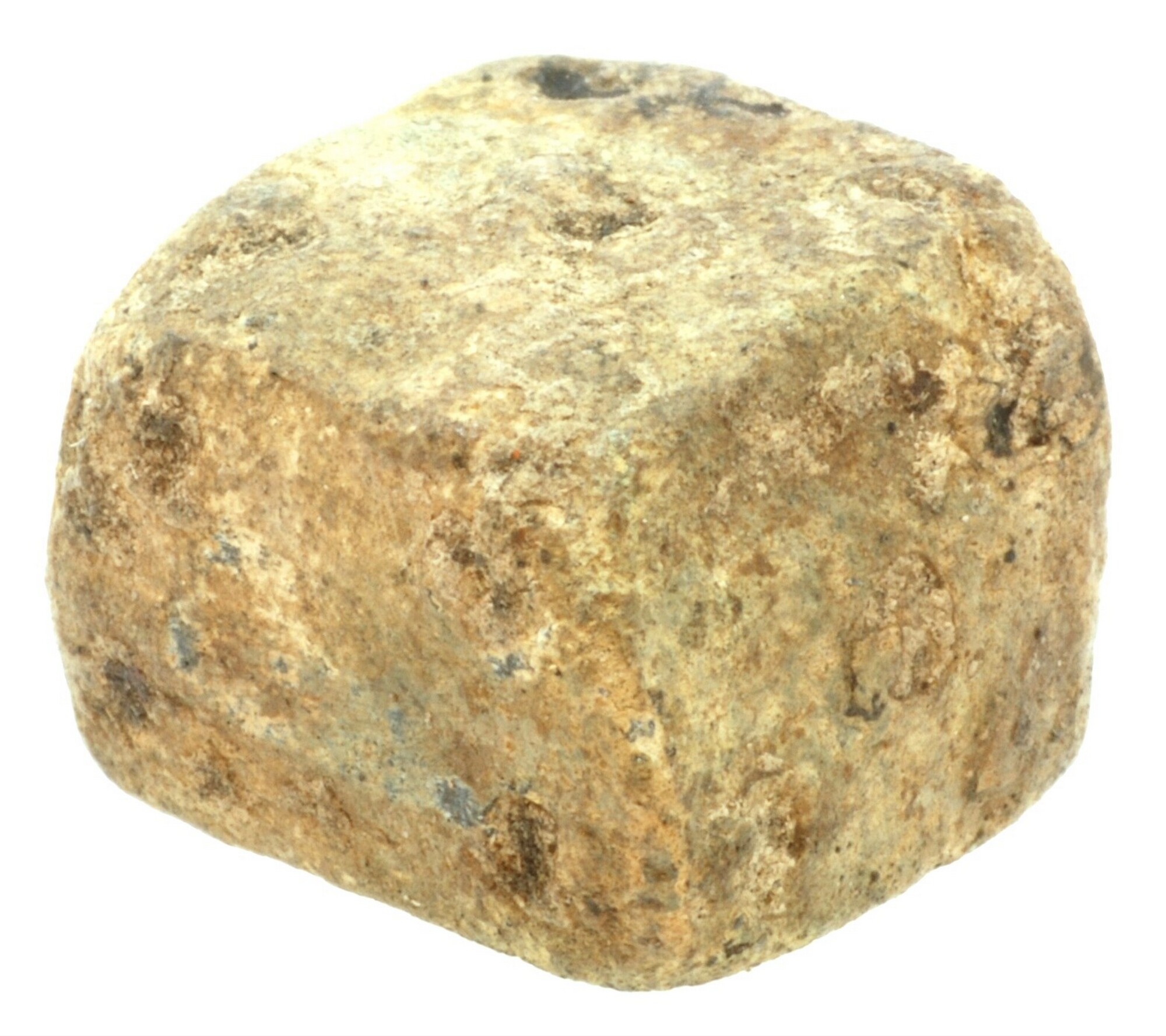 Dobbelsteen; niet geheel vierkant en vrij primitief gevormd. Cijfers zijn slecht leesbaar